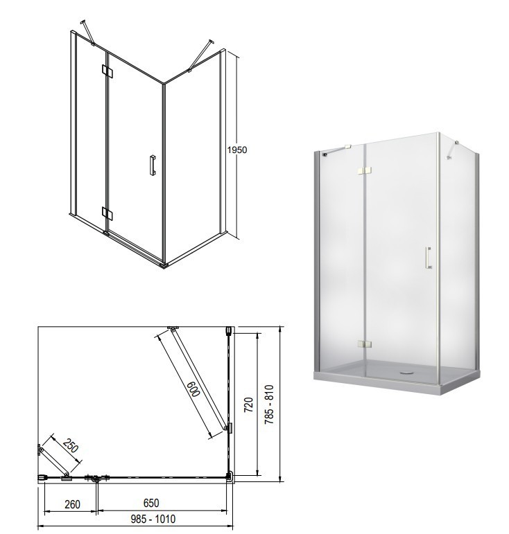 otvárajú do priestoru. Spodná hrana dverného skla je opatrená odkvapničkou , vďaka ktorej voda zo skla pri otvorení nestečie do priestoru kúpeľne , ale do vnútorného priestoru kúta. Kút je možné objednať v troch rozmeroch 100×80×195 cm , 120×80×195 cm alebo 120×90×195 cm.