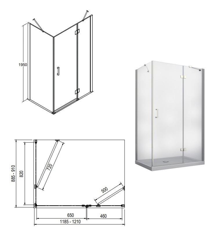 otvárajú do priestoru. Spodná hrana dverné skla je opatrená odkvapničkou, vďaka ktorej voda zo skla pri otvorení nezteče do priestoru kúpeľne, ale do vnútorného priestoru kúta. Kút je možné objednať v troch rozmeroch 100 × 80 × 195 cm, 120 × 80 × 195 cm alebo 120 × 90 × 195 cm.