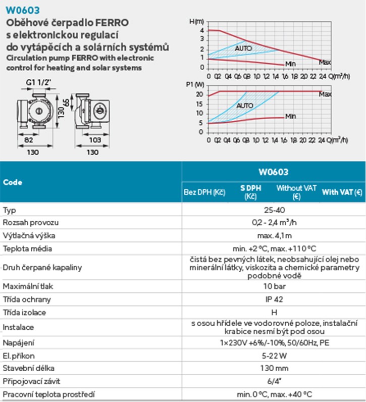 Oběhové elektronické čerpadlo Ferro 25-40/130mm
