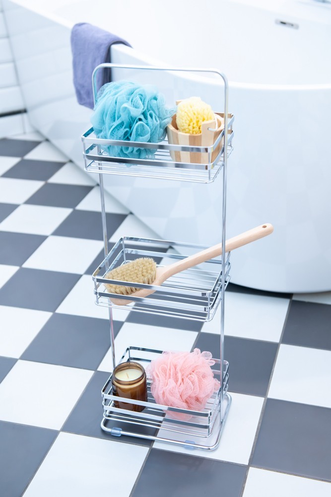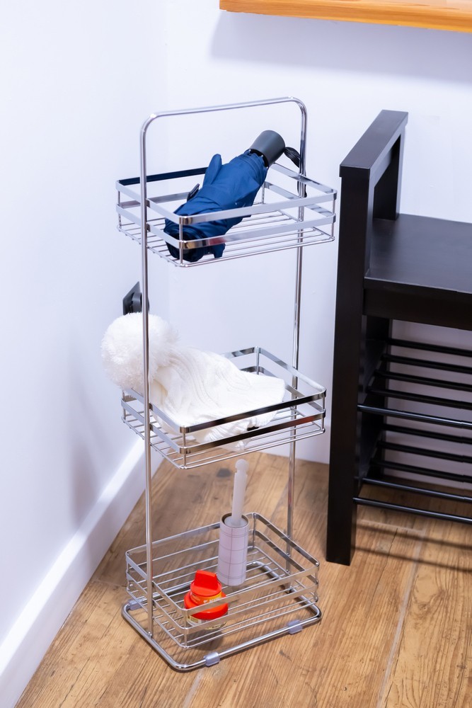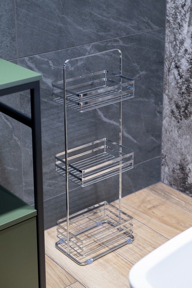 Polica s 3 policami v striebornej farbe, vyrobená z masívnej ocele potiahnutej lesklým chrómom. Je ťažký a veľmi stabilný. Skvele sa hodí ako ďalší úložný priestor ako v kúpeľni, tak aj v kuchyni. Jeho minimalistická a klasická forma bude dobre fungovať a doplní mnoho interiérových aranžmánov v rôznych štýloch. Na spodnej strane má plastové nôžky, ktoré ochránia policu a povrch, na ktorý bude umiestnená, pred poškriabaním a poškodením. Nepochybnou výhodou police je, že nevyžaduje montáž. Stačí ho umiestniť na vhodné miesto a môžete si užívať jeho plnú funkčnosť.