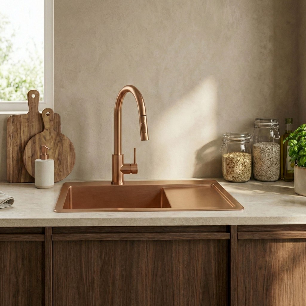 Oceľový drez Fín vo vyhotovení brúsená meď spája moderný dizajn a praktickosť, vďaka čomu sa skvele hodí do každej kuchyne. Je vyrobený z vysoko kvalitnej nerezovej ocele AISI 304 (hrúbka 2 mm) a vyniká vysokou odolnosťou proti korózii, poškriabaniu aj vysokým teplotám, takže zostáva dlhodobo odolný a spoľahlivý. Hlboká, priestranná vaňa zaisťuje pohodlie pri každodennom používaní. Drez je vybavený otvorom pre batériu, čo umožňuje rýchlu a jednoduchú montáž armatúry. Produkt má odtok farebne zladený s povrchovou úpravou, vďaka čomu celok pôsobí jednotne a elegantne. Hygienický povrch a ľahké čistenie hladkých prvkov pomáhajú udržať drez v bezchybnom stave a obmedzujú možnosť rozvoja mikroorganizmov. Produkt je dostupný v dvoch variantoch: bez batérie alebo v sete s kuchynskou batériou Fresh s.