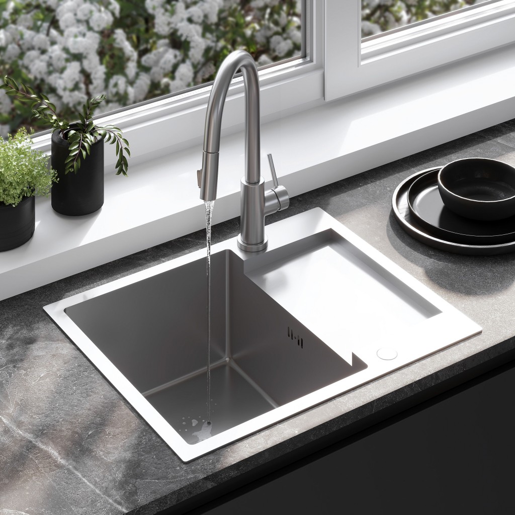 Oceľový drez Paul je dostupný v elegantných povrchových úpravách brúsená oceľ, čierna a brúsené zlato . Spája moderný dizajn s vysokou praktickosťou, čo z neho robí ideálnu voľbu pre každú kuchyňu. Drez je vyrobený z vysoko kvalitnej nerezovej ocele AISI 304 (hrúbka 2 mm), ktorá je odolná proti korózii, poškriabaniu a vysokým teplotám, čo zaručuje jeho dlhú životnosť a spoľahlivosť. Hlboká a priestranná komora ponúka vysoký komfort pri používaní.