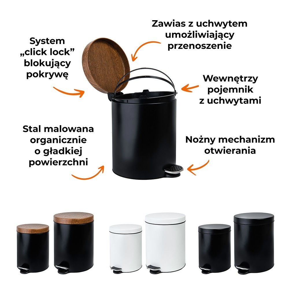 Kúpeľňový odpadkový kôš vyrobený v Poľsku. Je vyrobená z organicky lakovanej ocele. Má hygienické otváranie nôh a zámok veka. Vnútri je vložka s držadlami vyrobenými výhradne z plastu. Na nádobu na odpad je záruka 5 rokov.