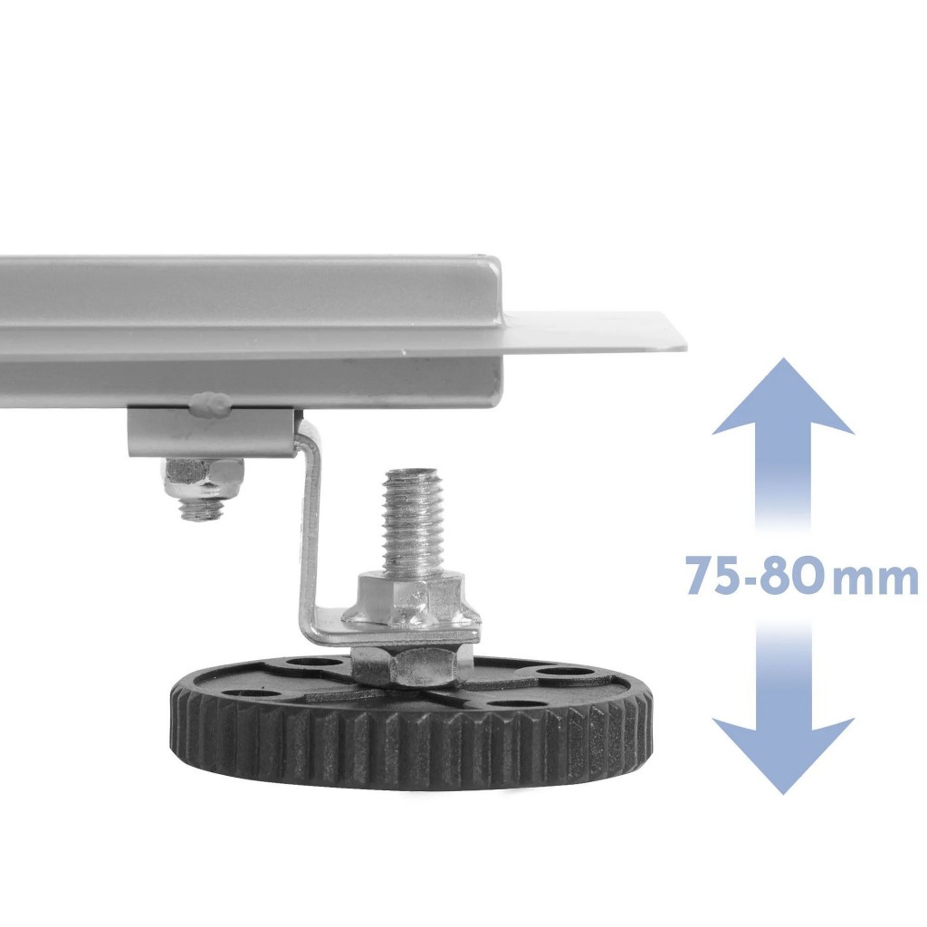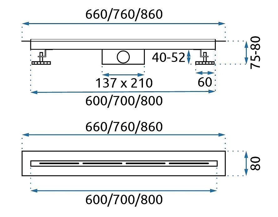 Odtokový žľab je celý vyrobený z kyselinovzdornej nerezovej ocele Aisi 304. Je vybavený radom inovatívnych technológií, ktoré uľahčujú montáž a každodenné používanie. V odtoku je použitý dvojitý filtračný systém, ktorý dokonale zabraňuje vnikaniu nečistôt a predmetov, ktoré môžu blokovať odtok vody do kanalizácie. Výhodou tohto systému je ľahké čistenie. Sada obsahuje: nohy, sifón, Dry-Fix manžetu, košík, užívateľskú príručku a háčik na výmenu krytu žľabu.