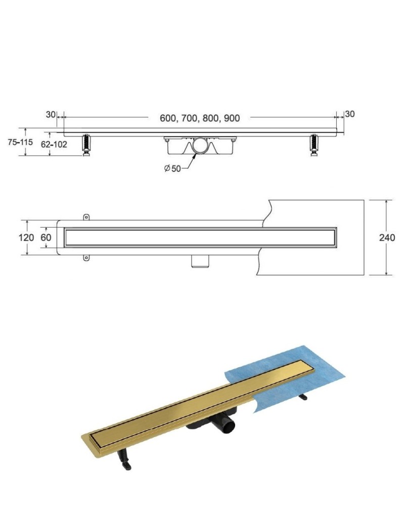 Kvalitne a moderne spracovaný odtokový žľab. Telo žľabu aj vlastný rošt je vyrobený z veľmi kvalitnej nereze a sú oba s povrchovou úpravou v zlatej farbe . Rošt je možné použiť buď na vloženie dlažby , alebo ako pohľadový (zlatá farba). Tento žľab obohatí každú kúpeľňu o nádych luxusu. Sada obsahuje: žľab so sifónom a nožičkami, rošt a hydroizolačnú pásku.
