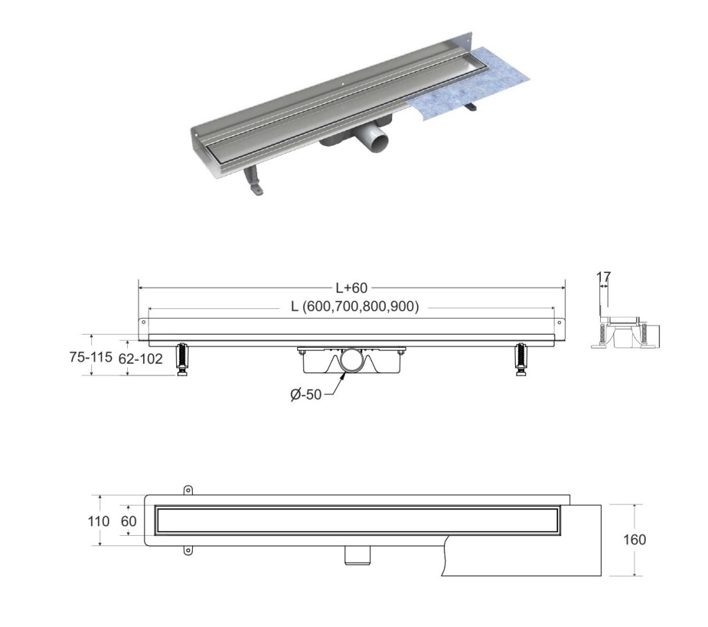 Kvalitne a moderne spracovaný odtokový žľab. T lo žľabu aj vlastné r OST je vyrobený z veľmi kvalitnej nereze, rošt s povrchovou úpravou kartáčovaný chróm. Rošt možno použiť buď pre vloženie dlažby, alebo ako pohľadový (kartáčovaný chróm). Tento žľab obohatí každú kúpeľňu o nádych luxusu. Sada obsahuje: žľab so sifónom a nožičkami, rošt a hydroizolačné pásku.