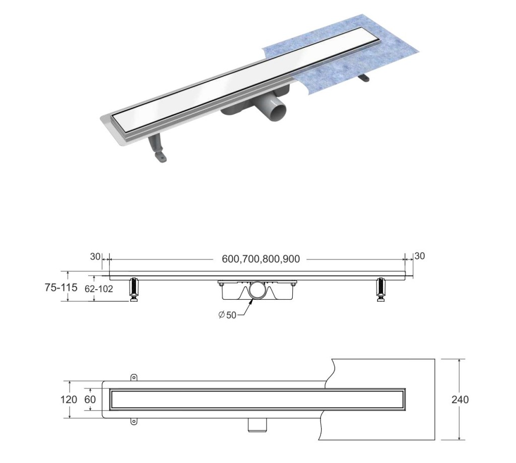 Kvalitne a moderne spracovaný odtokový žľab, vyrobený kombináciou nerezua roštu s bielym sklom obohatí každú kúpeľňu o nádych luxusu. Sada obsahuje: žľab so sifónom a nožičkami, rošt a hydroizolačné pásku