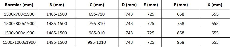 Inštalačný rozmer posuvných dverí do sprchového kúta je 1485-1500 mm. Samotné dvere, ktorými budete vchádzať do sprchy, majú 72,5 cm . Tie sa ale vďaka kovovému madlu nezasúvajú celé, takže vstup do sprchy budete mať 65,5 cm .