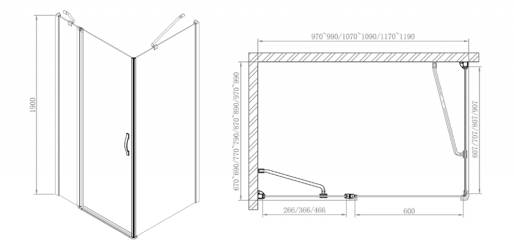 - Na mieru je možné vyrobiť aj pevné časti štvrťkruhového sprchovacieho kúta tak, aby vznikol atypický štvrťkruh s rozmerom 1000x800 alebo 1200x900 mm