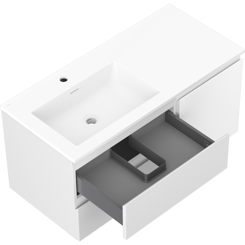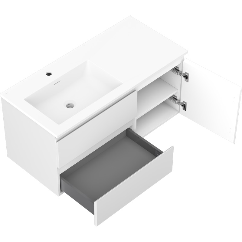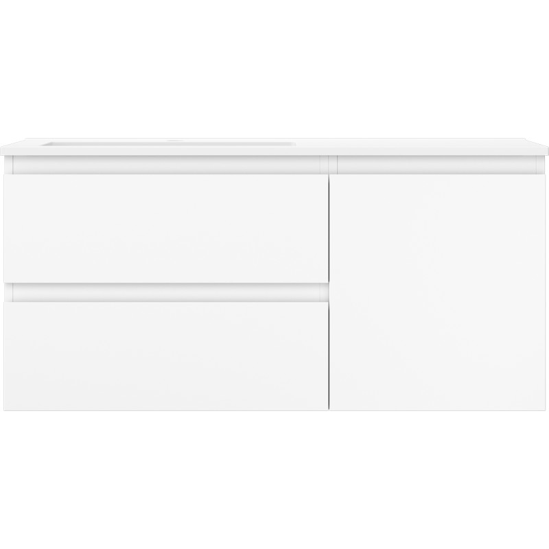 Špecifikácia produktu: Rozmery skrinky: Šírka: 100 cm Hĺbka: 46 cm Výška: 47 cm Sada obsahuje: Zásuvková skrinka pod umývadlo: Šírka: 60 cm Hĺbka: 46 cm Výška: 47 cm Farba korpusu: Matná biela Materiál korpus čelá: Lakovaná MDF doska Konštrukcia čela: Hladká Počet zásuviek: 2 Priestranná zásuvka s funkciou tlmeného dovierania Umývadlová skrinka s dvierkami: Šírka: 40 cm Výška: 47 cm Hĺbka: 46 cm Farba korpusu Matná biela Materiál korpus čela: Lakovaná MDF doska Konštrukcia čela: Hladká Počet dvierok: 1 1 polica Pánty s funkciou tlmeného dovierania Univerzálna montáž dvierok (ľavé/pravé) Povrch odolný voči UV žiareniu Umývadlo: Šírka: 101 cm Hĺbka: 46,5 cm Výška: umývadlá: Konglomerát Otvor pre prepad: Áno Otvor pre batériu: Áno Produkt zmontovaný