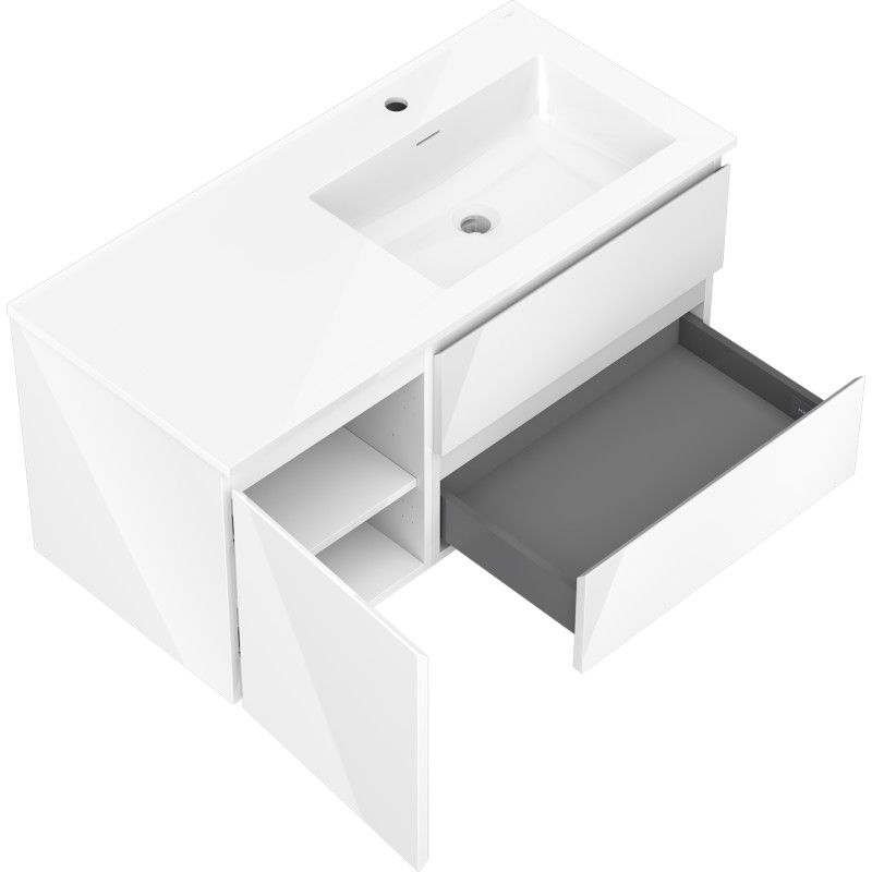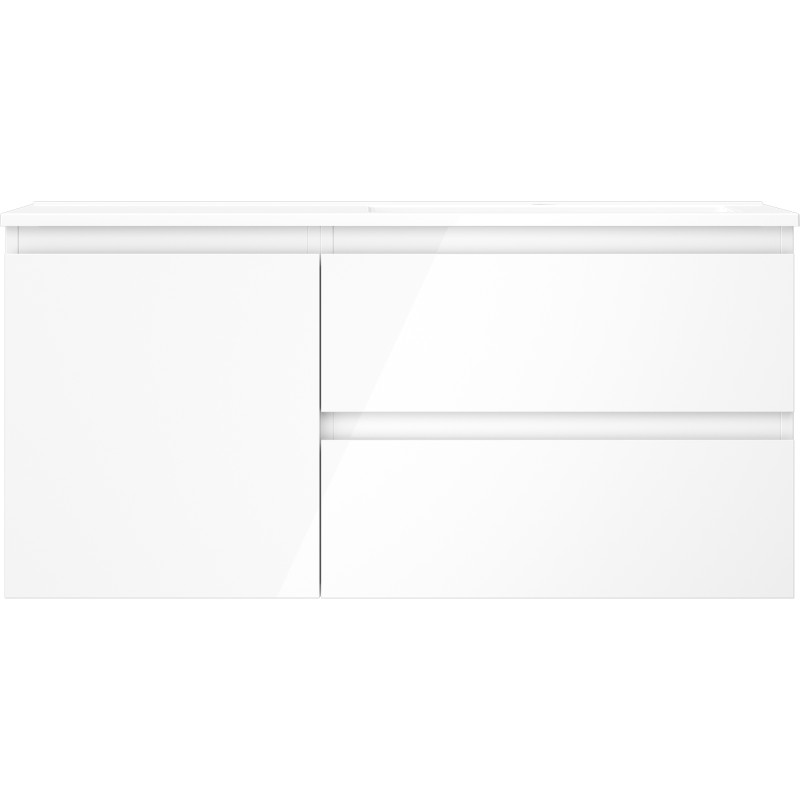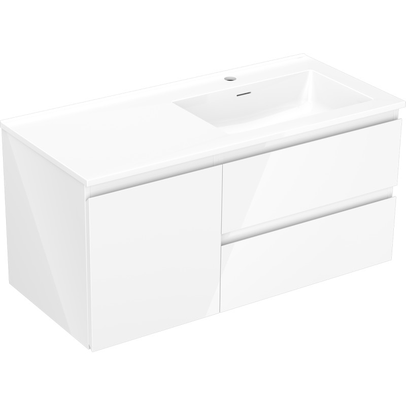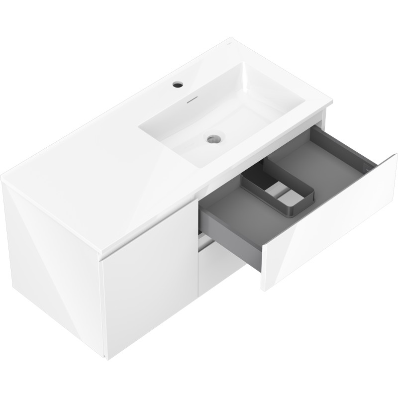 Špecifikácia produktu: Rozmery skrinky: Šírka: 100 cm Hĺbka: 46 cm Výška: 47 cm Sada obsahuje: Zásuvková skrinka pod umývadlo: Šírka: 60 cm Hĺbka: 46 cm Výška: 47 cm Farba korpusu: Biely lesk Materiál korpus čela: Lakovaná MDF doska Konštrukcia čela: Hladká Počet zásuviek: 2 Priestranná zásuvka s funkciou tlmeného dovierania Umývadlová skrinka s dvierkami: Šírka: 40 cm Výška: 47 cm Hĺbka: 46 cm Farba korpusu: Biely lak lesk Materiál korpus čelá: Lakovaná MDF doska Konštrukcia čela: Hladká Počet dvierok: 1 1 polica Pánty s funkciou tlmeného dovierania Univerzálna montáž dvierok (ľavé/pravé) UV odolný povrch Umývadlo: Šírka: 101 cm Hĺbka: 46,5 cm Výška: 16,5 cm umývadlá: Konglomerát Otvor pre prepad: Áno Otvor pre batériu: Áno Zmontovaný výrobok