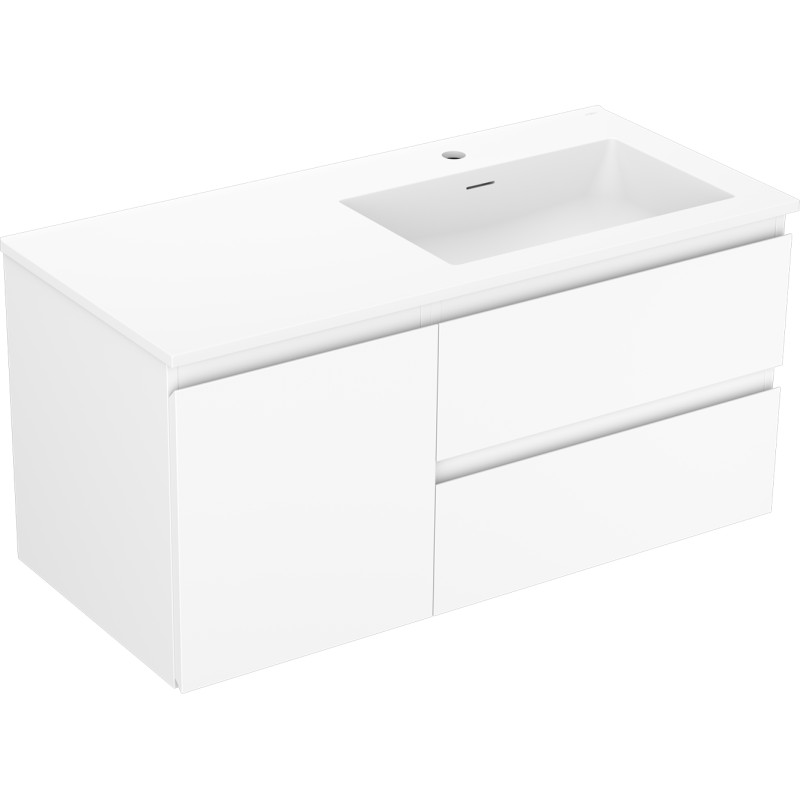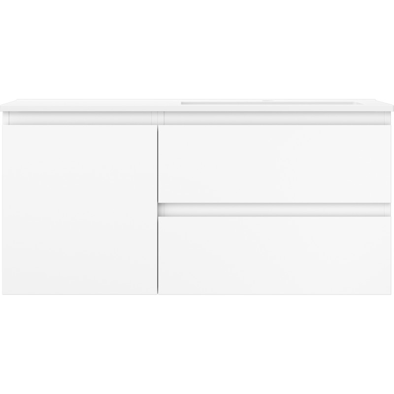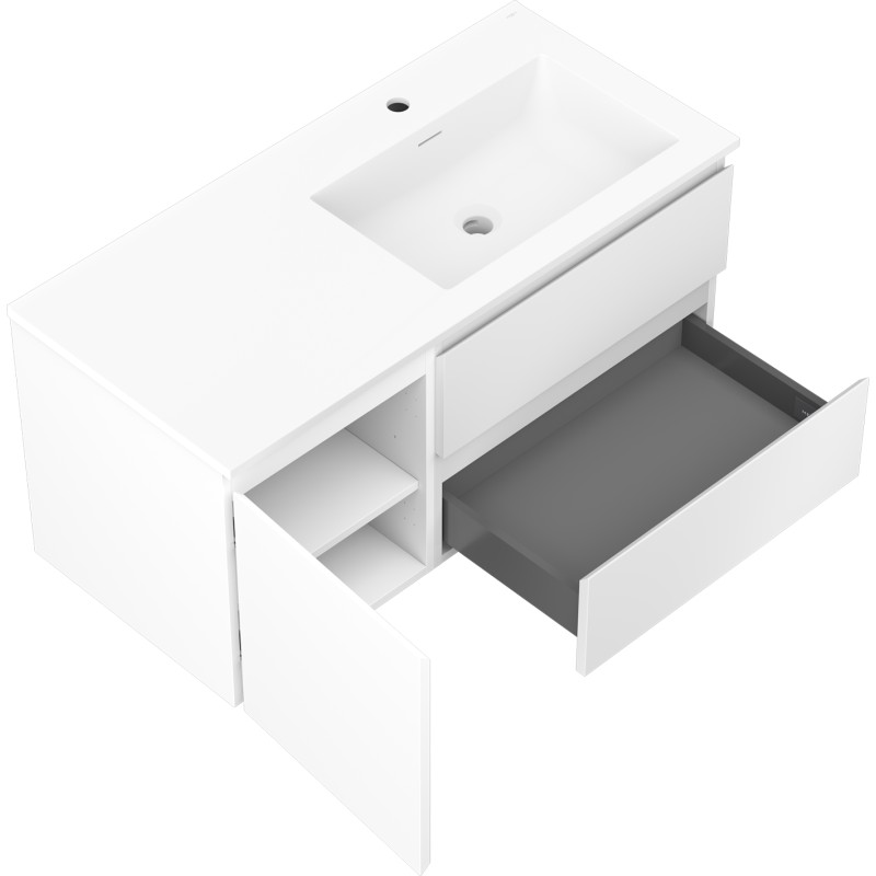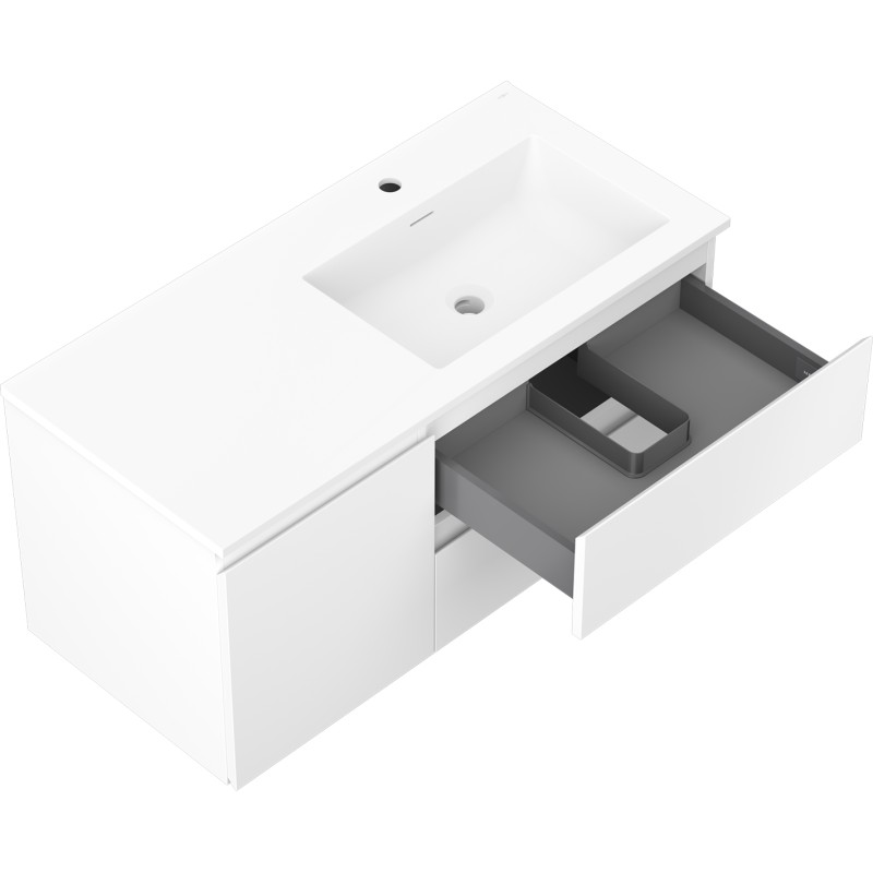Špecifikácia produktu: Rozmery skrinky: Šírka: 100 cm Hĺbka: 46 cm Výška: 47 cm Sada obsahuje: Zásuvková skrinka pod umývadlo: Šírka: 60 cm Hĺbka: 46 cm Výška: 47 cm Farba korpusu: Matná biela Materiál korpus čela: Lakovaná MDF doska Konštrukcia čela: Hladká Počet zásuviek: 2 Priestranná zásuvka s funkciou tlmeného dovierania Umývadlová skrinka s dvierkami: Šírka: 40 cm Výška: 47 cm Hĺbka: 46 cm Farba korpusu Matná biela Materiál korpus čela: Lakovaná MDF doska Konštrukcia čela: Hladká Počet dvierok: 1 1 polica Pánty s funkciou tlmeného dovierania Univerzálna montáž dvierok (ľavé/pravé) Povrch odolný voči UV žiareniu Umývadlo: Šírka: 101 cm Hĺbka: 46,5 cm Výška: umývadlá: Konglomerát Otvor pre prepad: Áno Otvor pre batériu: Áno Produkt zmontovaný
