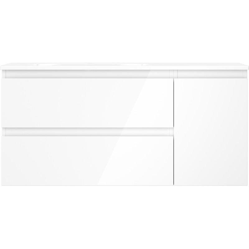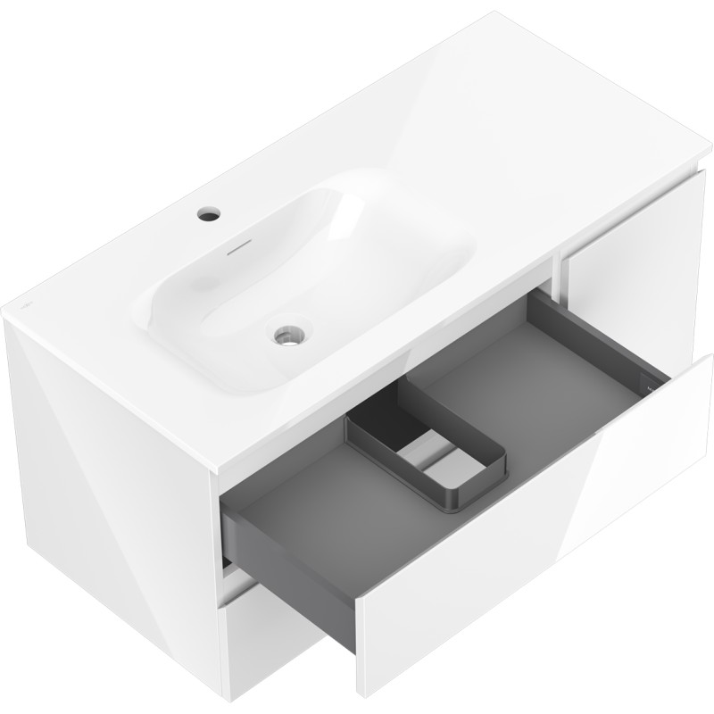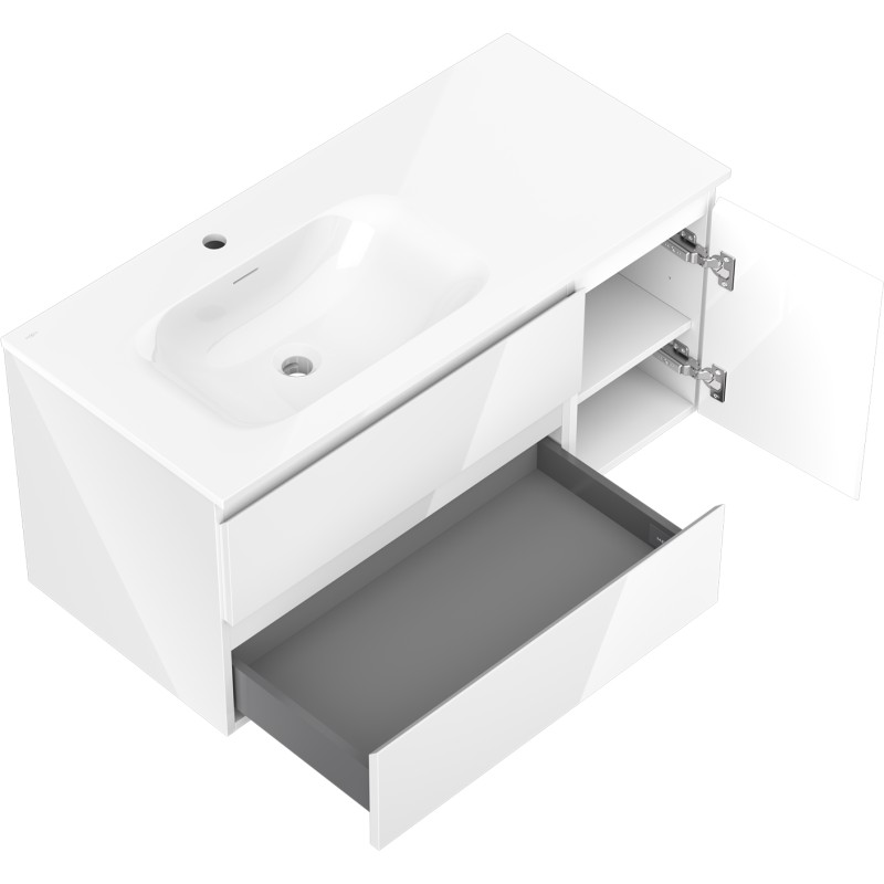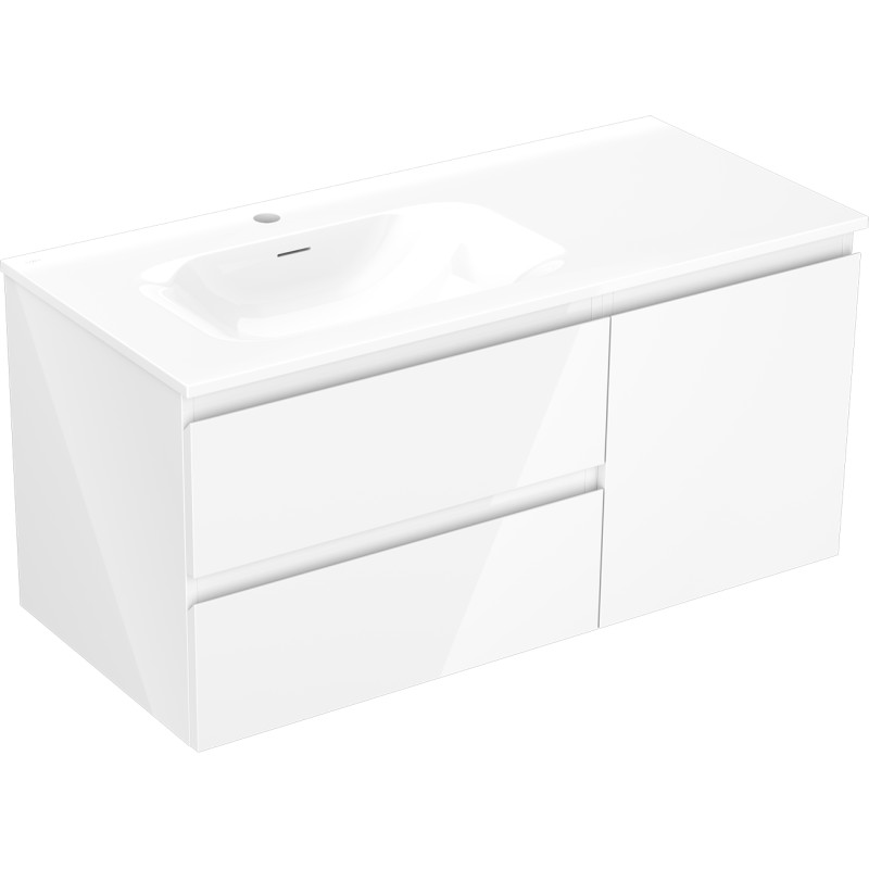 Špecifikácia produktu: Rozmery skrinky: Šírka: 100 cm Hĺbka: 46 cm Výška: 47 cm Sada obsahuje: Zásuvková skrinka pod umývadlo: Šírka: 60 cm Hĺbka: 46 cm Výška: 47 cm Farba korpusu: Biely lesk Materiál korpus čela: Lakovaná MDF doska Konštrukcia čela: Hladká Počet zásuviek: 2 Priestranná zásuvka s funkciou tlmeného dovierania Umývadlová skrinka s dvierkami: Šírka: 40 cm Výška: 47 cm Hĺbka: 46 cm Farba korpusu: Biely lak lesk Materiál korpus čelá: Lakovaná MDF doska Konštrukcia čela: Hladká Počet dvierok: 1 1 polica Pánty s funkciou tlmeného dovierania Univerzálna montáž dvierok (ľavé/pravé) UV odolný povrch Umývadlo: Šírka: 101 cm Hĺbka: 46,5 cm Výška: 16,5 cm umývadlá: Konglomerát Otvor pre prepad: Áno Otvor pre batériu: Áno Zmontovaný výrobok