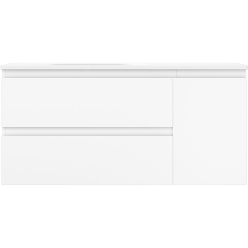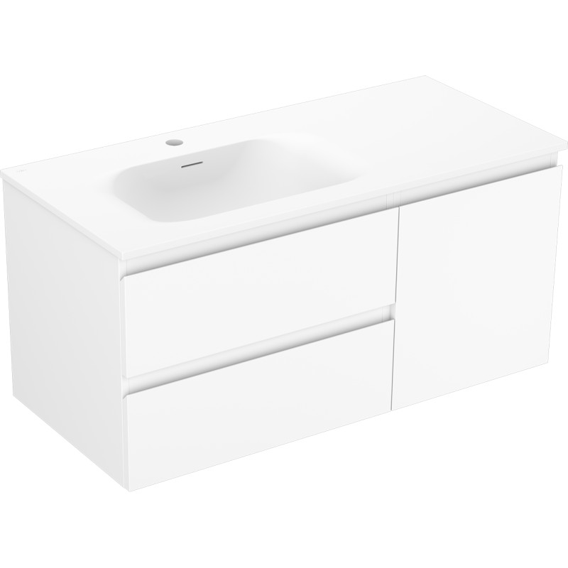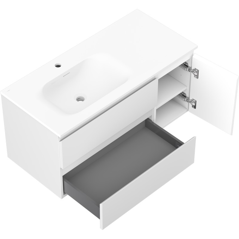 Špecifikácia produktu: Rozmery skrinky: Šírka: 100 cm Hĺbka: 46 cm Výška: 47 cm Sada obsahuje: Zásuvková skrinka pod umývadlo: Šírka: 60 cm Hĺbka: 46 cm Výška: 47 cm Farba korpusu: Matná biela Materiál korpus čelá: Lakovaná MDF doska Konštrukcia čela: Hladká Počet zásuviek: 2 Priestranná zásuvka s funkciou tlmeného dovierania Umývadlová skrinka s dvierkami: Šírka: 40 cm Výška: 47 cm Hĺbka: 46 cm Farba korpusu Matná biela Materiál korpus čela: Lakovaná MDF doska Konštrukcia čela: Hladká Počet dvierok: 1 1 polica Pánty s funkciou tlmeného dovierania Univerzálna montáž dvierok (ľavé/pravé) Povrch odolný voči UV žiareniu Umývadlo: Šírka: 101 cm Hĺbka: 46,5 cm Výška: umývadlá: Konglomerát Otvor pre prepad: Áno Otvor pre batériu: Áno Produkt zmontovaný