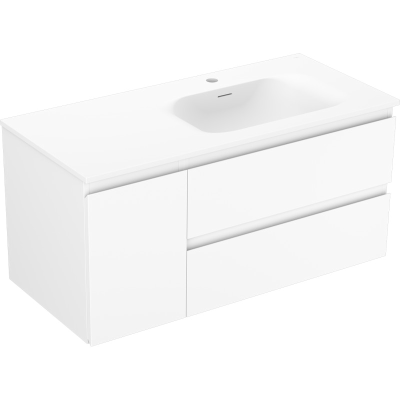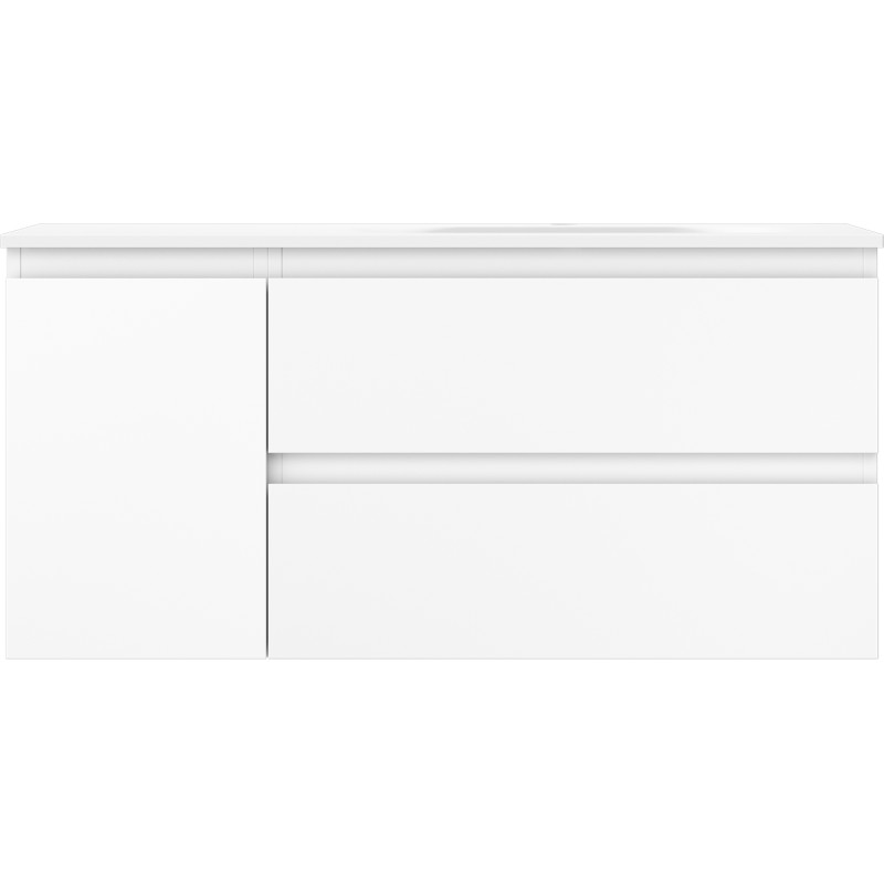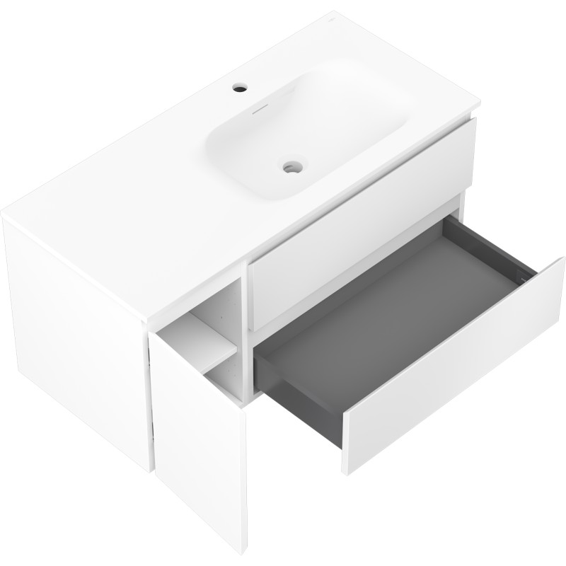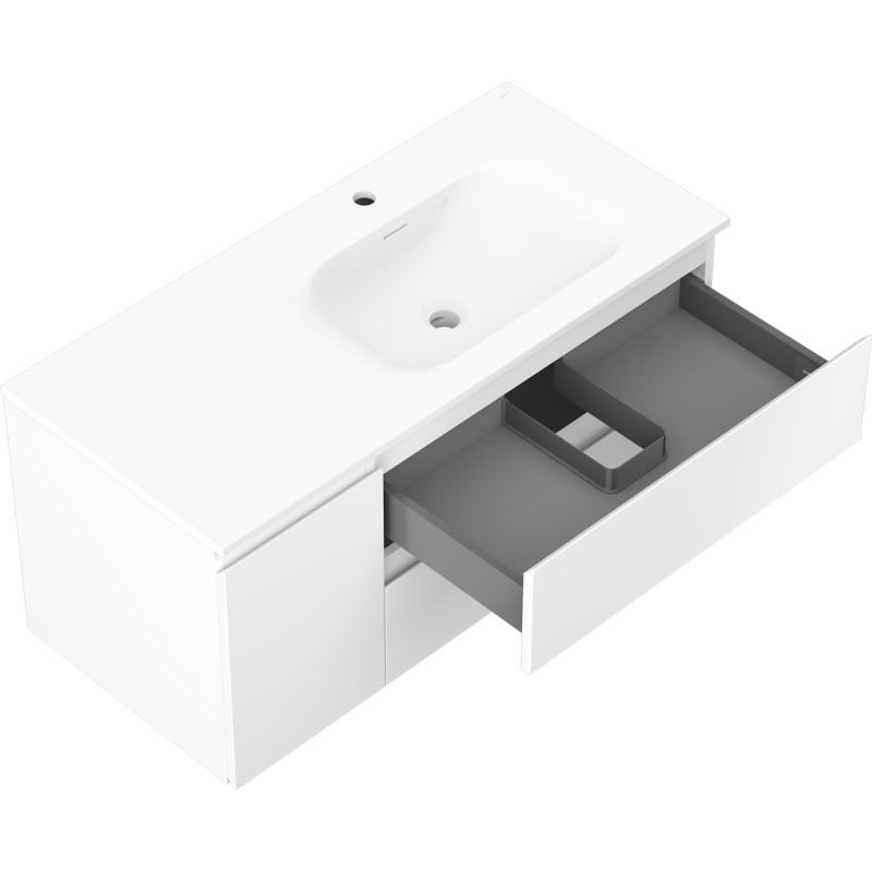 Špecifikácia produktu: Rozmery skrinky: Šírka: 100 cm Hĺbka: 46 cm Výška: 47 cm Sada obsahuje: Zásuvková skrinka pod umývadlo: Šírka: 60 cm Hĺbka: 46 cm Výška: 47 cm Farba korpusu: Matná biela Materiál korpus čela: Lakovaná MDF doska Konštrukcia čela: Hladká Počet zásuviek: 2 Priestranná zásuvka s funkciou tlmeného dovierania Umývadlová skrinka s dvierkami: Šírka: 40 cm Výška: 47 cm Hĺbka: 46 cm Farba korpusu Matná biela Materiál korpus čela: Lakovaná MDF doska Konštrukcia čela: Hladká Počet dvierok: 1 1 polica Pánty s funkciou tlmeného dovierania Univerzálna montáž dvierok (ľavé/pravé) Povrch odolný voči UV žiareniu Umývadlo: Šírka: 101 cm Hĺbka: 46,5 cm Výška: umývadlá: Konglomerát Otvor pre prepad: Áno Otvor pre batériu: Áno Produkt zmontovaný