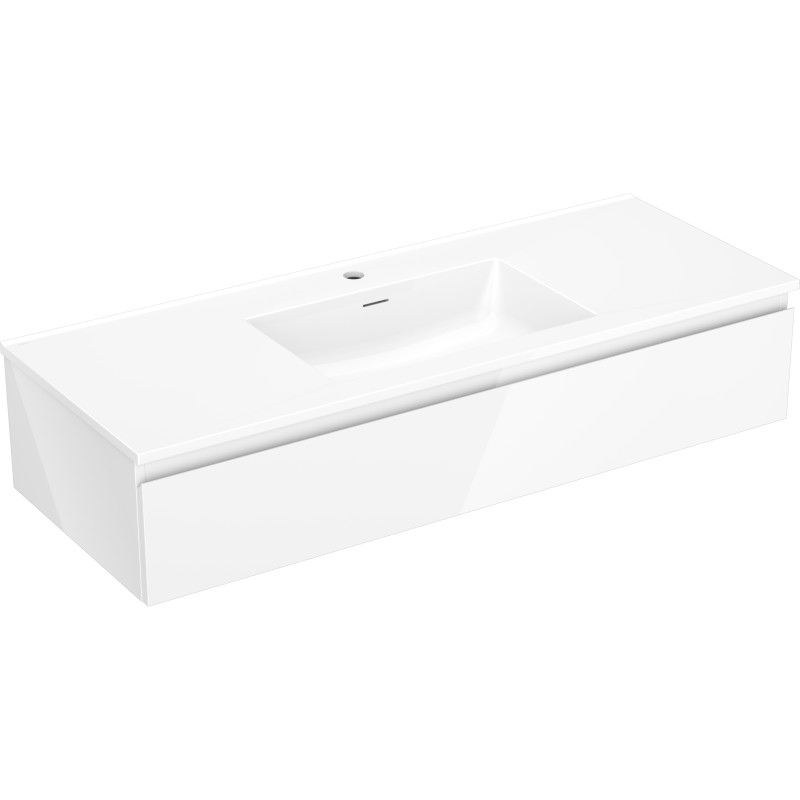 Špecifikácia produktu: Rozmery skrinky: Šírka: 120 cm Hĺbka: 46 cm Výška: 23,5 cm Farba korpusu: Lesklá biela Materiál korpusu: Lakovaná doska Farba čela: Lesklá biela Materiál čela: Lakovaná MDF doska Štruktúra čela: Hladká Počet zásuviek: Povrch odolný voči UV žiareniu Rozmery umývadla: Šírka: 121 cm Hĺbka: 46,5 cm Výška: 16,5 cm Farba umývadla: Lesklá biela Materiál umývadla: Konglomerát Otvor pre prepad: Áno Otvor pre batériu: Áno Zmontovaný výrobok