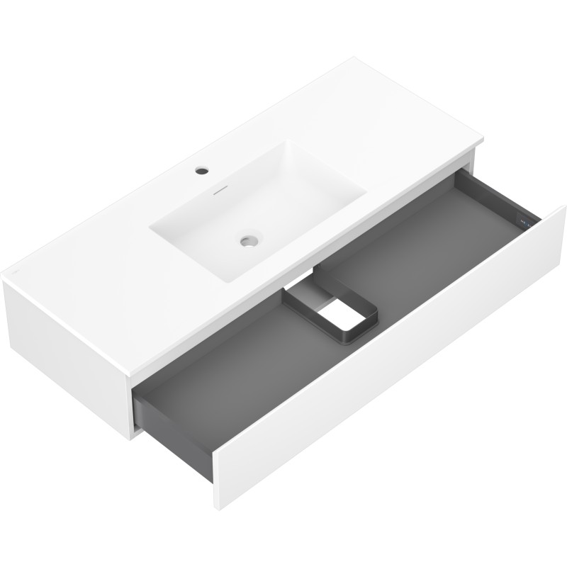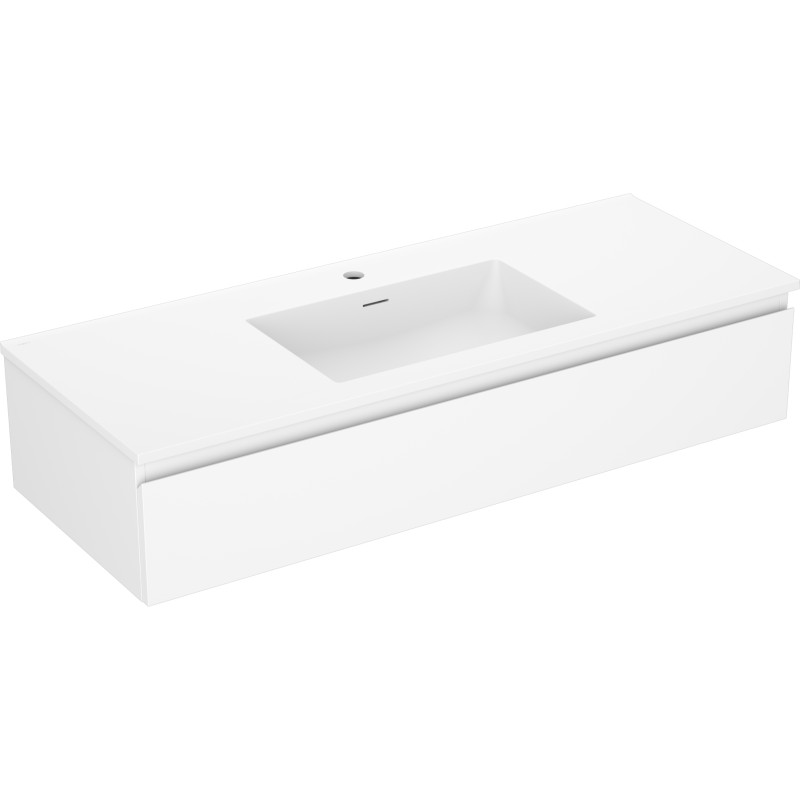 Špecifikácia produktu: Rozmery skrinky: Šírka: 120 cm Hĺbka: 46 cm Výška: 23,5 cm Farba korpusu: Matná biela Materiál korpusu: Lakovaná doska Farba čela: Matná biela Materiál čela: Lakovaná MDF doska Štruktúra čela: Hladká Počet zásuviek: Povrch odolný voči UV žiareniu Rozmery umývadla: Šírka: 121 cm Hĺbka: 46,5 cm Výška: 16,5 cm Farba umývadla: Matná biela Materiál umývadla: Konglomerát Otvor na prepad: Áno Otvor na batériu: Áno Zmontovaný výrobok