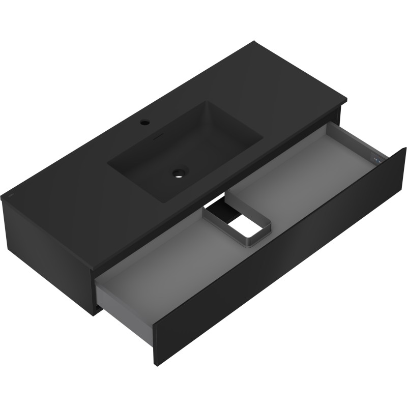 Špecifikácia produktu: Rozmery skrinky: Šírka: 120 cm Hĺbka: 46 cm Výška: 23,5 cm Farba korpusu: Matná čierna Materiál korpusu: Lakovaná doska Farba čela: Matná čierna Materiál čela: Lakovaná MDF doska Štruktúra čela: Hladká Počet zásuviek: 1 UV žiarenie Rozmery umývadla: Šírka: 121 cm Hĺbka: 46,5 cm Výška: 16,5 cm Farba umývadla: Matná čierna Materiál umývadla: Konglomerát Otvor na prepad: Áno Otvor na batériu: Áno Zmontovaný výrobok