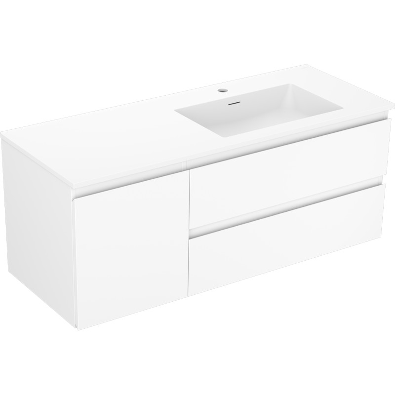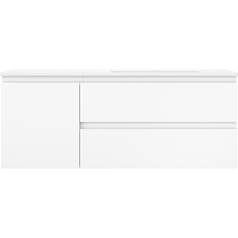 Špecifikácia produktu: Rozmery skrinky: Šírka: 120 cm Hĺbka: 46 cm Výška: 47 cm Sada obsahuje: Zásuvková skrinka pod umývadlo: Šírka: 80 cm Hĺbka: 46 cm Výška: 47 cm Farba korpusu: Matná biela Materiál korpus čelá: Lakovaná MDF doska Konštrukcia čela: Hladká Počet zásuviek: 2 Priestranná zásuvka s funkciou tlmeného dovierania Umývadlová skrinka s dvierkami: Šírka: 40 cm Výška: 47 cm Hĺbka: 46 cm Farba korpusu Matná biela Materiál korpus čelá: Lakovaná MDF doska Konštrukcia čela: Hladká Počet dvierok: 1 1 polica Pánty s funkciou tlmeného dovierania Univerzálna montáž dvierok (ľavé/pravé) Povrch odolný voči UV žiareniu Umývadlo: Šírka: 121 cm Hĺbka: 46,5 cm Výška: umývadlá: Konglomerát Otvor pre prepad: Áno Otvor pre batériu: Áno Produkt zmontovaný