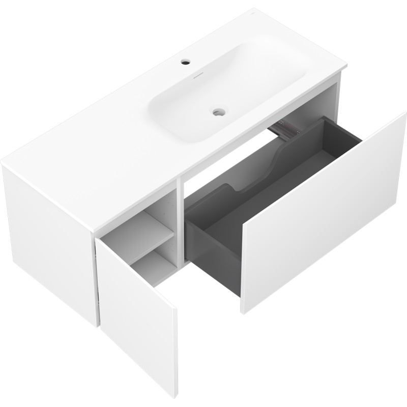 Špecifikácia produktu: Rozmery skrinky: Šírka: 120 cm Hĺbka: 46 cm Výška: 47 cm Sada obsahuje: Zásuvková skrinka pod umývadlo: Šírka: 80 cm Hĺbka: 46 cm Výška: 47 cm Farba korpusu: Matná biela Materiál korpus čela: Lakovaná MDF doska Štruktúra čela: Hladká Počet zásuviek: 1 Priestranná zásuvka s funkciou tlmeného dovierania Umývadlová skrinka s dvierkami: Šírka: 40 cm Výška: 47 cm Hĺbka: 46 cm Farba korpusu: Matná biela Materiál korpus čela: Lakovaná MDF doska Štruktúra čela: Hladká Počet dvierok: 1 1 polica Pánty s funkciou tlmeného dovierania Univerzálna montáž dvierok (ľavé/pravé) Povrch odolný voči UV žiareniu Umývadlo: Šírka: 121 cm Hĺbka: 46,5 cm Výška: : umývadlá: Konglomerát Otvor pre prepad: Áno Otvor pre batériu: Áno Produkt zmontovaný