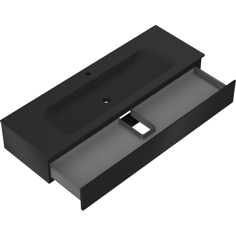 Špecifikácia produktu: Rozmery skrinky: Šírka: 140 cm Hĺbka: 46 cm Výška: 23,5 cm Farba korpusu: Matná čierna Materiál korpusu: Lakovaná doska Farba čela: Matná čierna Materiál čela: Lakovaná MDF doska Štruktúra čela: Hladká Počet zásuviek: 1 Pros UV žiarenie Rozmery umývadla: Šírka: 141 cm Hĺbka: 46,5 cm Výška: 16,5 cm Farba umývadla: Matná čierna Materiál umývadla: Konglomerát Otvor na prepad: Áno Otvor na batériu: Áno Zmontovaný výrobok