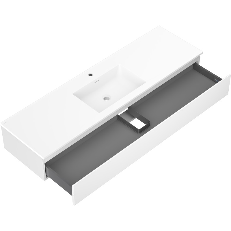 Špecifikácia produktu: Rozmery skrinky: Šírka: 160 cm Hĺbka: 46 cm Výška: 23,5 cm Farba korpusu: Matná biela Materiál korpusu: Lakovaná doska Farba čela: Matná biela Materiál čela: Lakovaná MDF doska Štruktúra čela: Hladká Počet zásuviek: Povrch odolný voči UV žiareniu Rozmery umývadla: Šírka: 161 cm Hĺbka: 46,5 cm Výška: 16,5 cm Farba umývadla: Matná biela Materiál umývadla: Konglomerát Otvor na prepad: Áno Otvor na batériu: Áno Zmontovaný výrobok