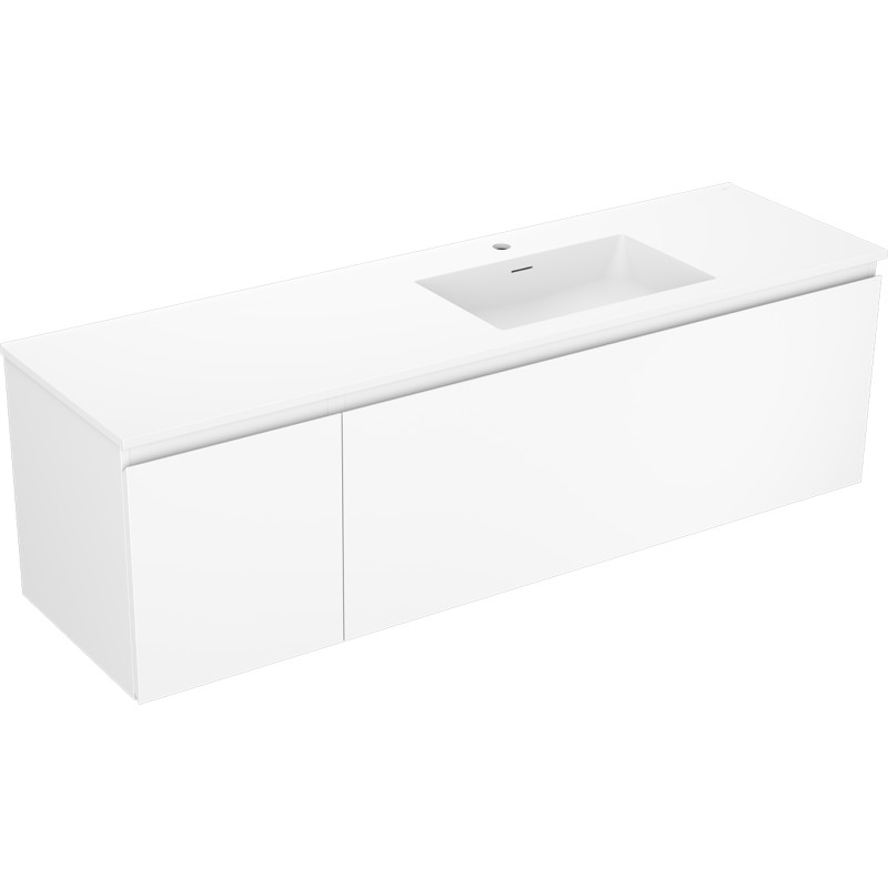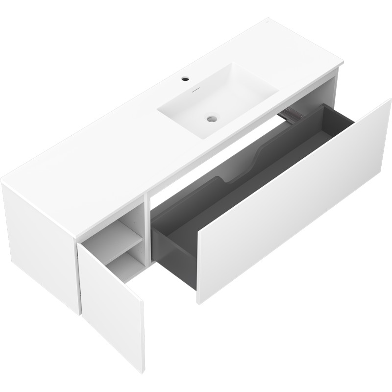 Špecifikácia produktu: Rozmery skrinky: Šírka: 160 cm Hĺbka: 46 cm Výška: 47 cm Sada obsahuje: Zásuvková skrinka pod umývadlo: Šírka: 120 cm Hĺbka: 46 cm Výška: 47 cm Farba korpusu Matná biela Materiál korpus čela: Lakovaná MDF doska Konštrukcia čela: Hladká Počet zásuviek: 1 Priestranná zásuvka s funkciou tlmeného dovierania Umývadlová skrinka s dvierkami: Šírka: 40 cm Výška: 47 cm Hĺbka: 46 cm Farba korpusu Matná biela Materiál korpus čelá: Lakovaná MDF doska Konštrukcia čela: Hladká Počet dvierok: 1 1 polica Pánty s funkciou tlmeného dovierania Univerzálna montáž dvierok (ľavé/pravé) Povrch odolný voči UV žiareniu Umývadlo: Šírka: 161 cm Hĺbka: 46,5 cm Výška: umývadlá: Konglomerát Otvor pre prepad: Áno Otvor pre batériu: Áno Produkt zmontovaný
