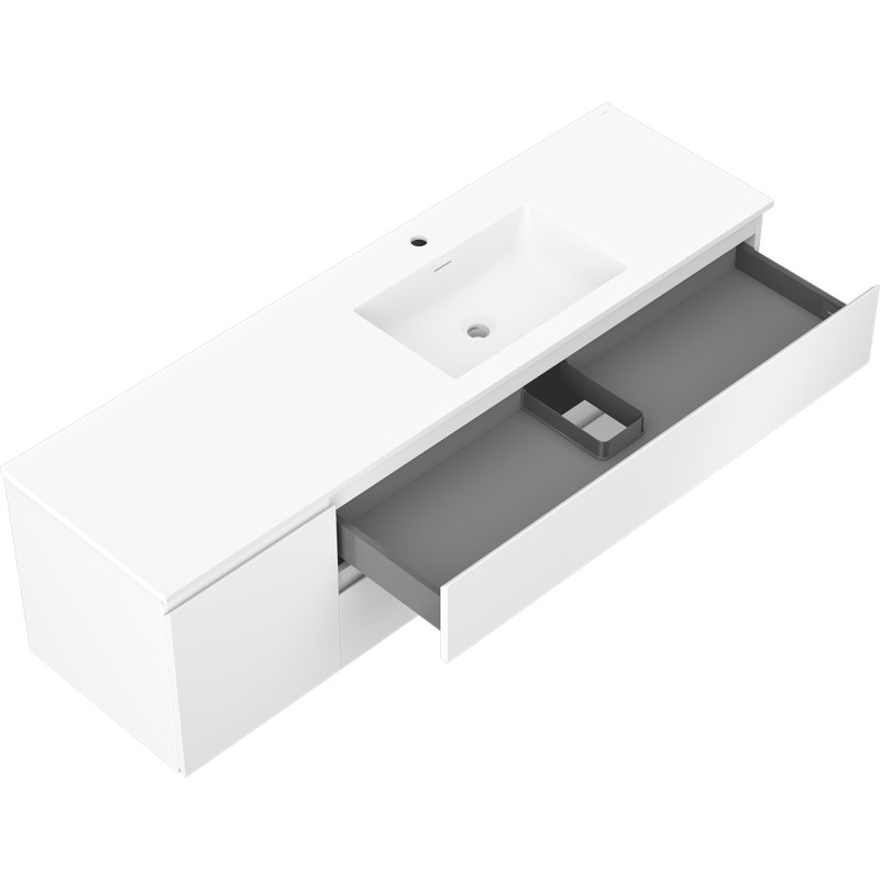 Špecifikácia produktu: Rozmery skrinky: Šírka: 160 cm Hĺbka: 46 cm Výška: 47 cm Sada obsahuje: Zásuvková skrinka pod umývadlo: Šírka: 120 cm Hĺbka: 46 cm Výška: 47 cm Farba korpusu Matná biela Materiál korpus čelá: Lakovaná MDF doska Konštrukcia čela: Hladká Počet zásuviek: 2 Priestranná zásuvka s funkciou tlmeného dovierania Umývadlová skrinka s dvierkami: Šírka: 40 cm Výška: 47 cm Hĺbka: 46 cm Farba korpusu Matná biela Materiál korpus čelá: Lakovaná MDF doska Konštrukcia čela: Hladká Počet dvierok: 1 1 polica Pánty s funkciou tlmeného dovierania Univerzálna montáž dvierok (ľavé/pravé) Povrch odolný voči UV žiareniu Umývadlo: Šírka: 161 cm Hĺbka: 46,5 cm Výška: umývadlá: Konglomerát Otvor pre prepad: Áno Otvor pre batériu: Áno Výrobok zmontovaný
