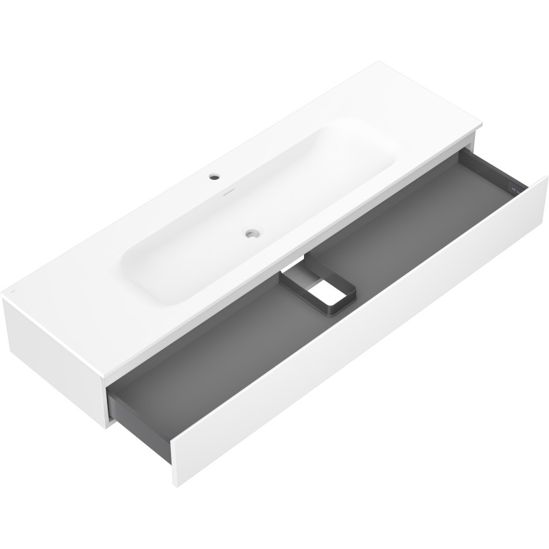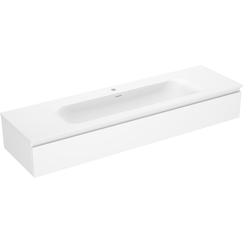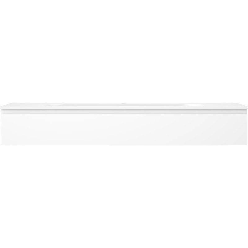 Špecifikácia produktu: Rozmery skrinky: Šírka: 160 cm Hĺbka: 46 cm Výška: 23,5 cm Farba korpusu: Matná biela Materiál korpusu: Lakovaná doska Farba čela: Matná biela Materiál čela: Lakovaná MDF doska Štruktúra čela: Hladká Počet zásuviek: Povrch odolný voči UV žiareniu Rozmery umývadla: Šírka: 161 cm Hĺbka: 46,5 cm Výška: 16,5 cm Farba umývadla: Matná biela Materiál umývadla: Konglomerát Otvor na prepad: Áno Otvor na batériu: Áno Zmontovaný výrobok