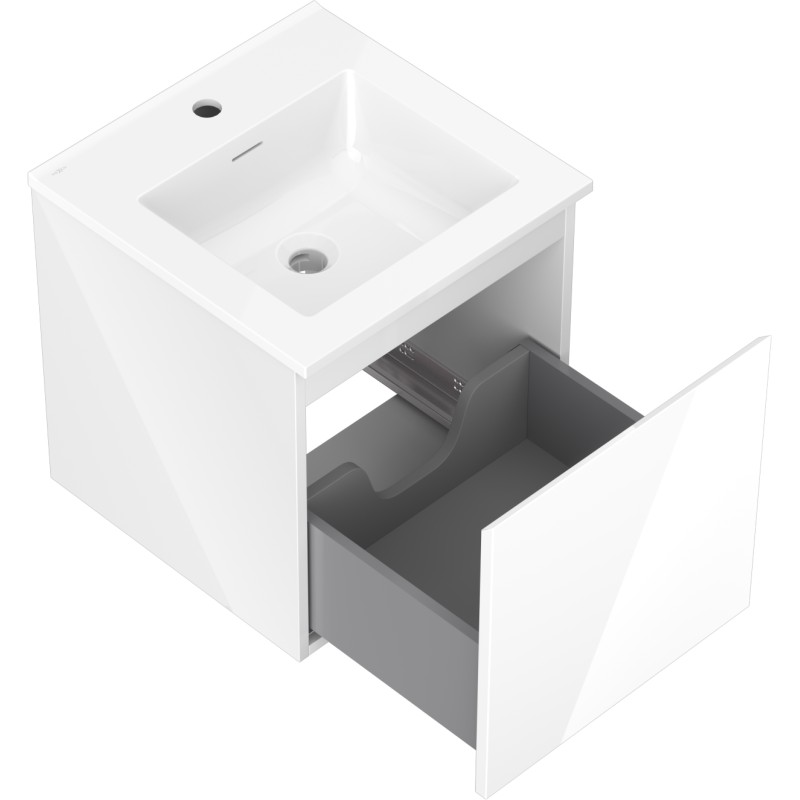 Špecifikácia produktu: Rozmery skrinky: Šírka: 45 cm Hĺbka: 46 cm Výška: 47 cm Farba korpusu: Lesklá biela Materiál korpusu: Lakovaná doska Farba čela: Lesklá biela Materiál čela: Lakovaná MDF doska Štruktúra čela: Hladká Počet zásuviek: 1 voči UV žiareniu Rozmery umývadla: Šírka: 46 cm Hĺbka: 46,5 cm Výška: 16,5 cm Farba umývadla: Lesklá biela Materiál umývadla: Konglomerát Otvor pre prepad: Áno Otvor pre batériu: Áno Zmontovaný výrobok