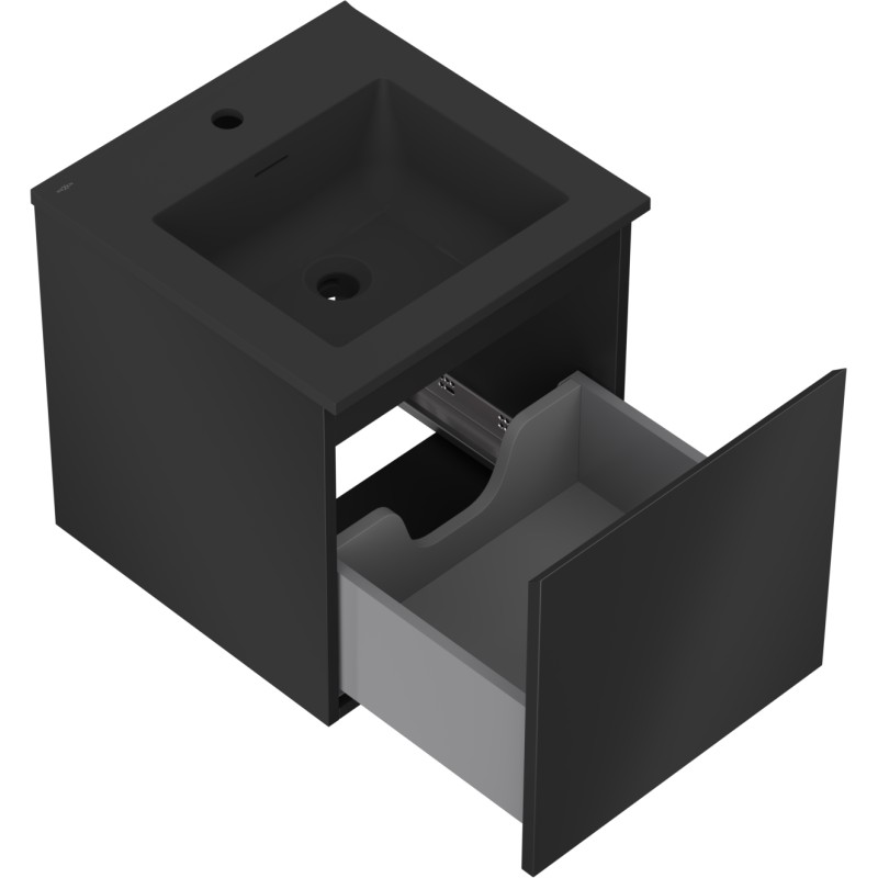 Špecifikácia produktu: Rozmery skrinky: Šírka: 45 cm Hĺbka: 46 cm Výška: 47 cm Farba korpusu: Matná čierna Materiál korpusu: Lakovaná doska Farba čela: Matná čierna Materiál čela: Lakovaná MDF doska Štruktúra čela: Hladká Počet zásuviek: 1 Priestranná zásuvka: 1 Priestranná zásuvka Rozmery umývadla: Šírka: 46 cm Hĺbka: 46,5 cm Výška: 16,5 cm Farba umývadla: Matná čierna Materiál umývadla: Konglomerát Otvor na prepad: Áno Otvor na batériu: Áno Zmontovaný výrobok
