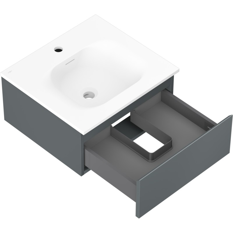 Špecifikácia produktu: Rozmery skrinky: Šírka: 50 cm Hĺbka: 46 cm Výška: 23,5 cm Farba korpusu: Matný grafit Materiál korpusu: Lakovaná doska Farba čela: Matný grafit Materiál čela: Lakovaná MDF doska Štruktúra čela: Hladká Počet zásuviek: Povrch odolný voči UV žiareniu Rozmery umývadla: Šírka: 51 cm Hĺbka: 46,5 cm Výška: 16,5 cm Farba umývadla: Matná biela Materiál umývadla: Konglomerát Otvor pre prepad: Áno Otvor pre batériu: Áno Zmontovaný výrobok