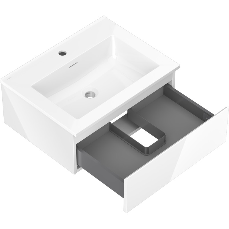 Špecifikácia produktu: Rozmery skrinky: Šírka: 60 cm Hĺbka: 46 cm Výška: 23,5 cm Farba korpusu: Lesklá biela Materiál korpusu: Lakovaná doska Farba čela: Lesklá biela Materiál čela: Lakovaná MDF doska Štruktúra čela: Hladká Počet zásuviek: odolný voči UV žiareniu Rozmery umývadla: Šírka: 61 cm Hĺbka: 46,5 cm Výška: 16,5 cm Farba umývadla: Lesklá biela Materiál umývadla: Konglomerát Otvor na prepad: Áno Otvor na batériu: Áno Zmontovaný výrobok