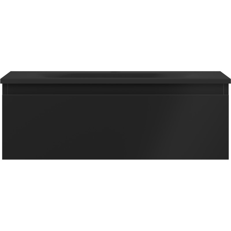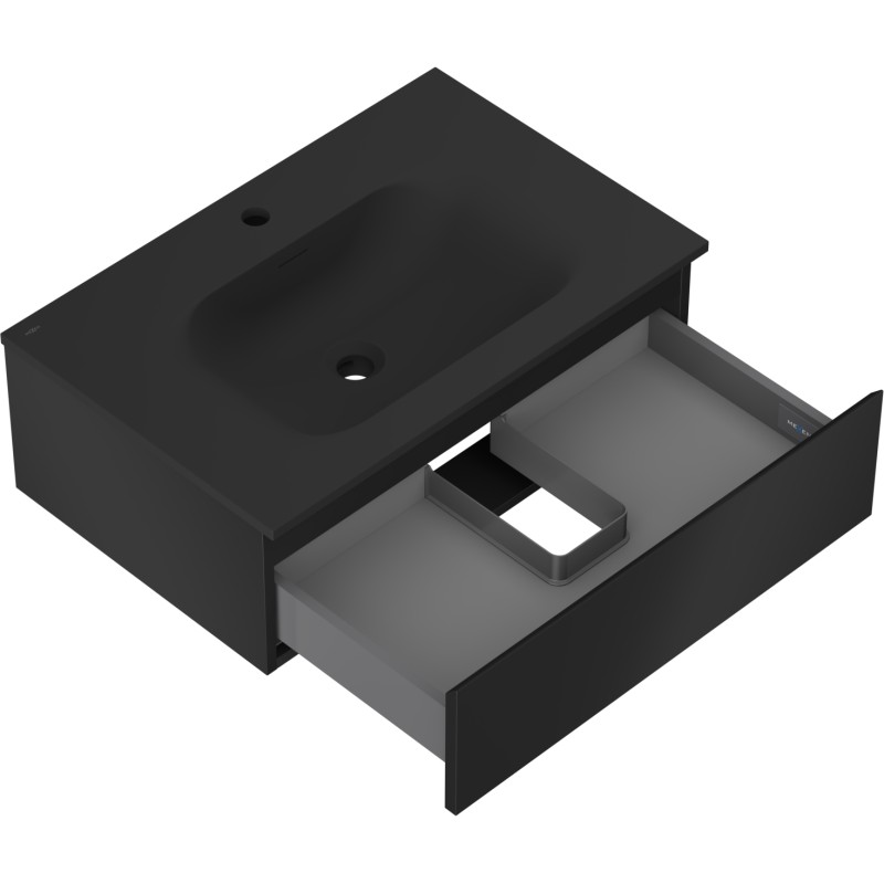 Špecifikácia produktu: Rozmery skrinky: Šírka: 70 cm Hĺbka: 46 cm Výška: 23,5 cm Farba korpusu: Matná čierna Materiál korpusu: Lakovaná doska Farba čela: Matná čierna Materiál čela: Lakovaná MDF doska Štruktúra čela: Hladká Počet zásuviek: 1 Priestor žiarenia Rozmery umývadla: Šírka: 71 cm Hĺbka: 46,5 cm Výška: 16,5 cm Farba umývadla: Matná čierna Materiál umývadla: Konglomerát Otvor pre prepad: Áno Otvor pre batériu: Áno Zmontovaný výrobok