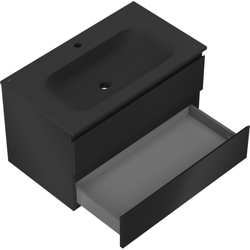 Špecifikácia produktu: Rozmery skrinky: Šírka: 80 cm Hĺbka: 46 cm Výška: 47 cm Farba korpusu: Matná čierna Materiál korpusu: Lakovaná doska Farba čela: Matná čierna Materiál čela: Lakovaná MDF doska Štruktúra čela: Hladká Počet zásuviek: 2 Priestranná zásuvka žiarenie Rozmery umývadla: Šírka: 81 cm Hĺbka: 46,5 cm Výška: 16,5 cm Farba umývadla: Matná čierna Materiál umývadla: Konglomerát Otvor pre prepad: Áno Otvor pre batériu: Áno Zmontovaný výrobok