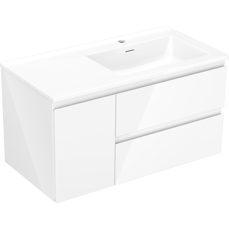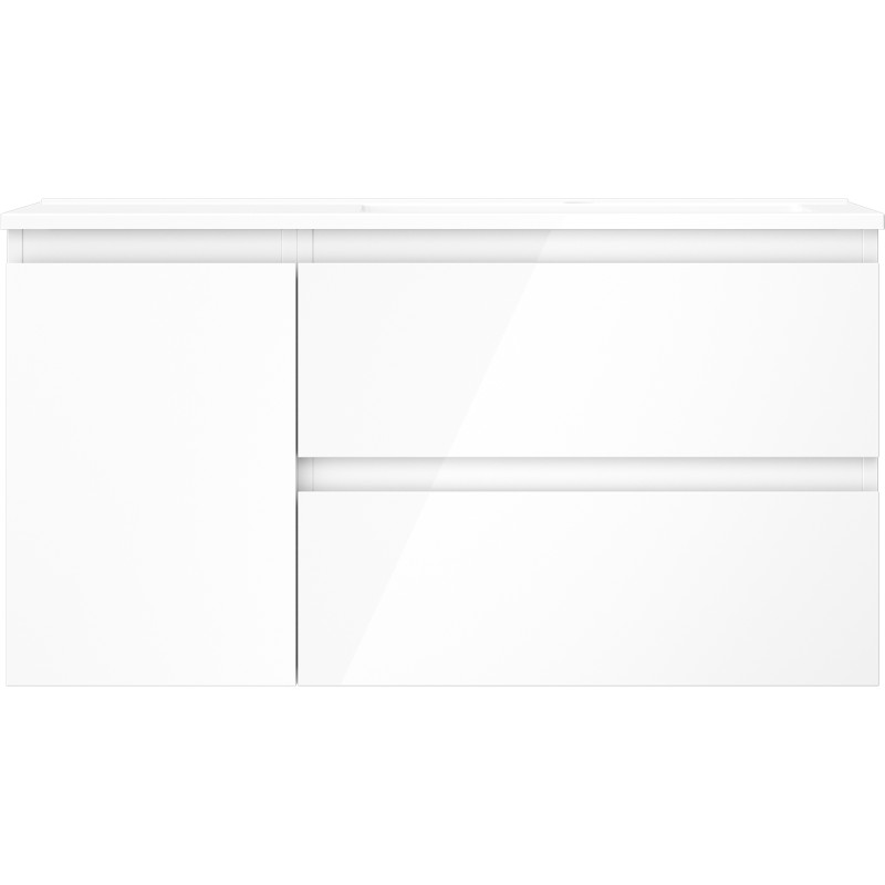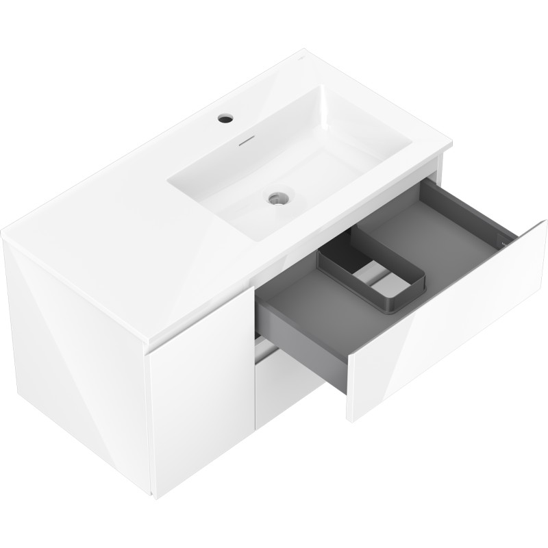 Špecifikácia produktu: Rozmery skrinky: Šírka: 90 cm Hĺbka: 46 cm Výška: 47 cm Sada obsahuje: Zásuvková skrinka pod umývadlo: Šírka: 60 cm Hĺbka: 46 cm Výška: 47 cm Farba korpusu: Biely lesk Materiál korpusu čelá: Lakovaná MDF doska Štruktúra čela: Hladká Počet zásuviek: 2 Priestranná zásuvka s funkciou tlmeného dovierania Povrch odolný proti UV žiareniu Skrinka pod umývadlo s dvierkami: Šírka: 30 cm Výška: 47 cm Hĺbka: 46 cm Farba korpusu Farba korpusu čela: Biely lesk Materiál čela: Lakovaná MDF doska Štruktúra čela: Hladká Počet dvierok: 1 1 polica Panty s funkciou tlmeného dovierania Univerzálna montáž dvierok (ľavé/pravé) Povrch odolný proti UV žiareniu Umývadlo: Šírka: 91 cm Hĺbka: 91 cm umývadlá: Lesklá biela Materiál umývadla: Konglomerát Otvor pre prepad: Áno Otvor pre batériu: Áno Zmontovaný produkt