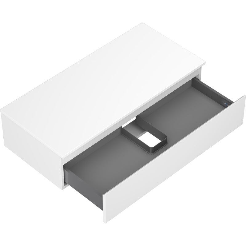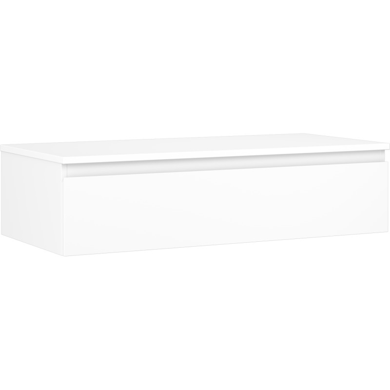 Špecifikácia produktu: Rozmery skrinky: Šírka: 100 cm Výška: 23,5 cm Hĺbka: 46 cm Farba korpusu: Matná biela Materiál korpusu: Lakovaná doska Farba čela: Matná biela Materiál čela: Lakovaná MDF doska Štruktúra čela: Hladká Počet zásuviek: Plný výsuv pre ľahký prístup k obsahu zásuvky Povrch odolný voči UV žiareniu Rozmery pracovnej dosky: Šírka: 100,6 cm Hĺbka: 46,5 cm Hrúbka: 1,8 cm Farba pracovnej dosky: Matná biela Materiál pracovnej dosky: Lakovaná MDF doska Povrch odolný voči UV žiareniu