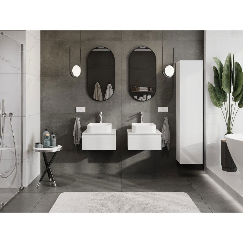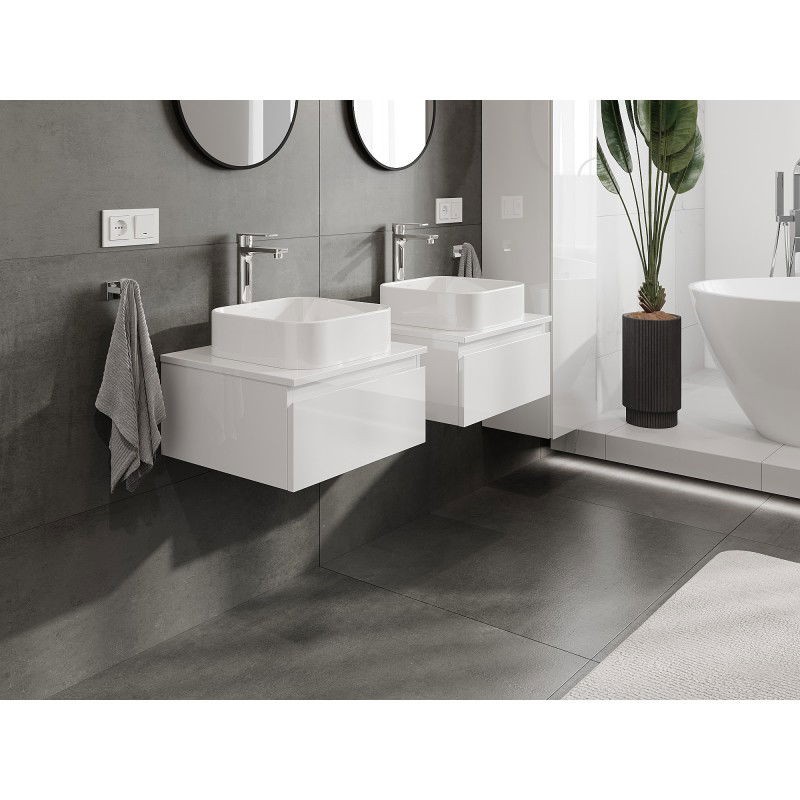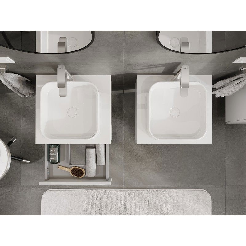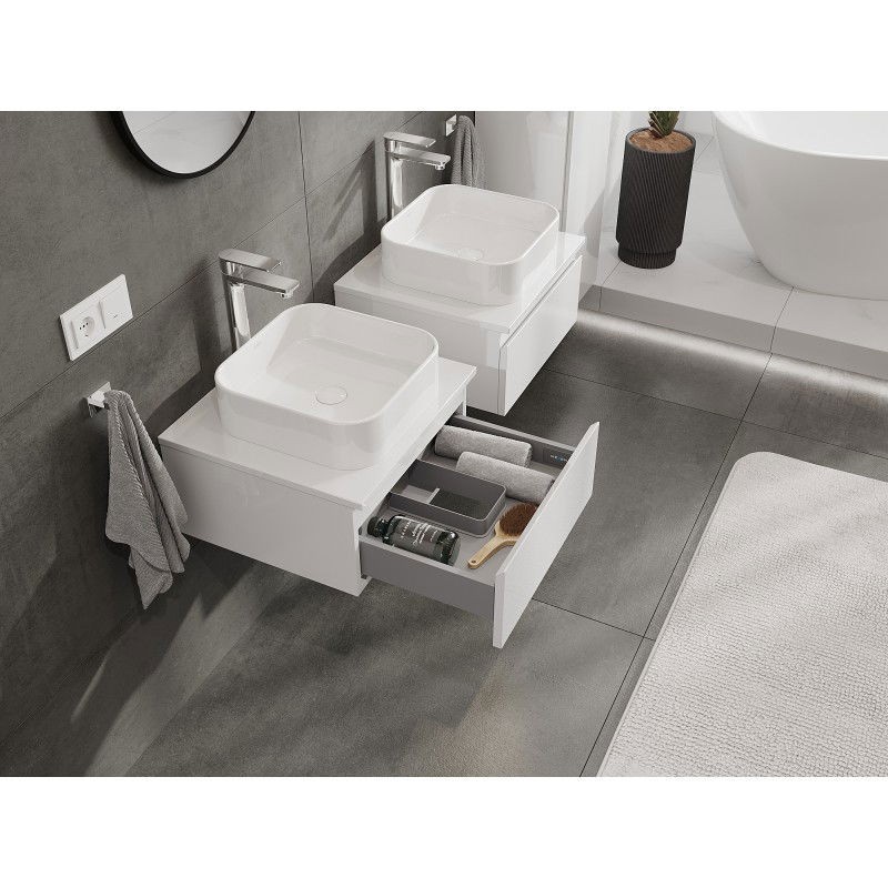 Špecifikácia produktu: Rozmery skrinky: Šírka: 50 cm Výška: 23,5 cm Hĺbka: 46 cm Farba korpusu: Lesklá biela Materiál korpusu: Lakovaná doska Farba čela: Lesklá biela Materiál čela: Lakovaná MDF doska Štruktúra čela: Hladká Počet zásuviek: výsuv pre ľahký prístup k obsahu zásuvky Povrch odolný voči UV žiareniu Rozmery pracovnej dosky: Šírka: 50,6 cm Hĺbka: 46,5 cm Hrúbka: 1,8 cm Farba pracovnej dosky: Lesklá biela Materiál pracovnej dosky: Lakovaná MDF doska Povrch odolný voči UV žiareniu Ideálny ako podstavec