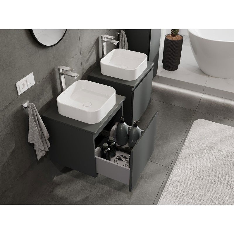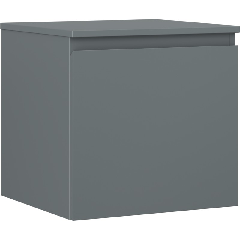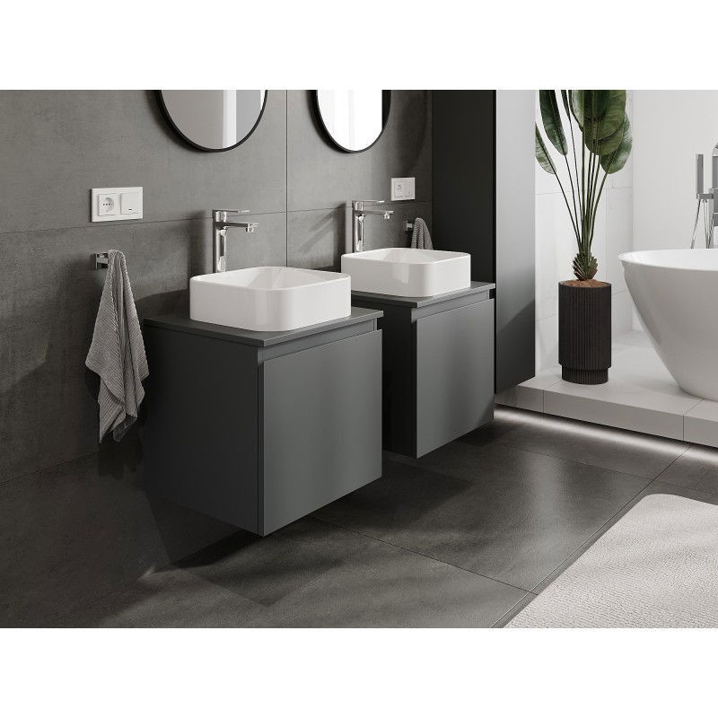 Špecifikácia produktu: Rozmery skrinky: Šírka: 50 cm Výška: 47 cm Hĺbka: 46 cm Farba korpusu: Matný grafit Materiál korpusu: Lakovaná doska Farba čela: Matný grafit Materiál čela: Lakovaná MDF doska Štruktúra čela: Hladká Počet zásuviek: 1 výsuv pre ľahký prístup k obsahu zásuvky Povrch odolný voči UV žiareniu Rozmery pracovnej dosky: Šírka: 50,6 cm Hĺbka: 46,5 cm Hrúbka: 1,8 cm Farba pracovnej dosky: Matný grafit Materiál pracovnej dosky: Lakovaná MDF doska Povrch odolný voči UV žiareniu Ideálny ako podstavec