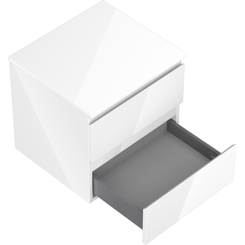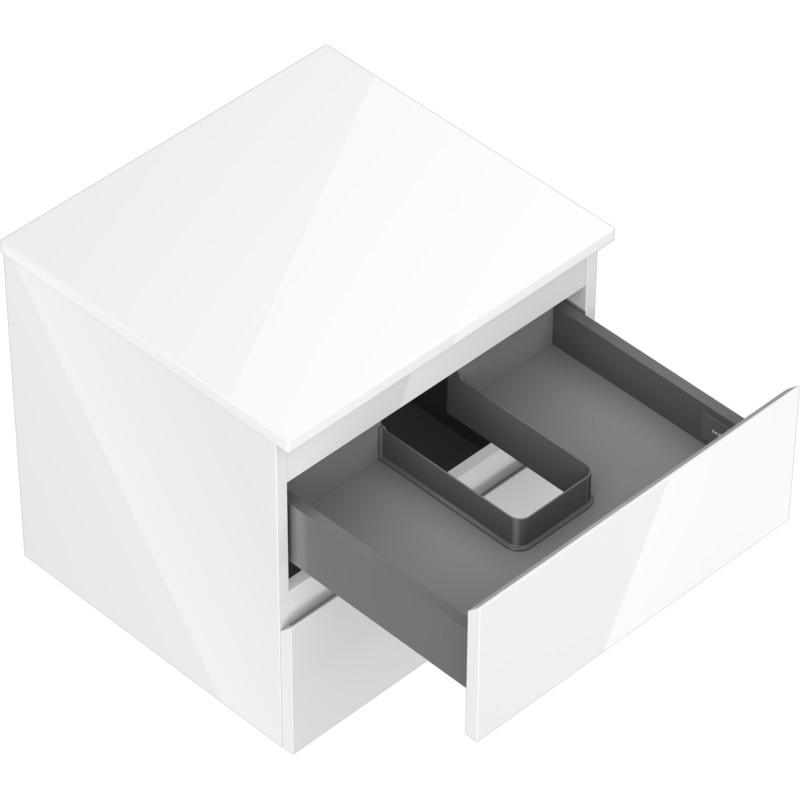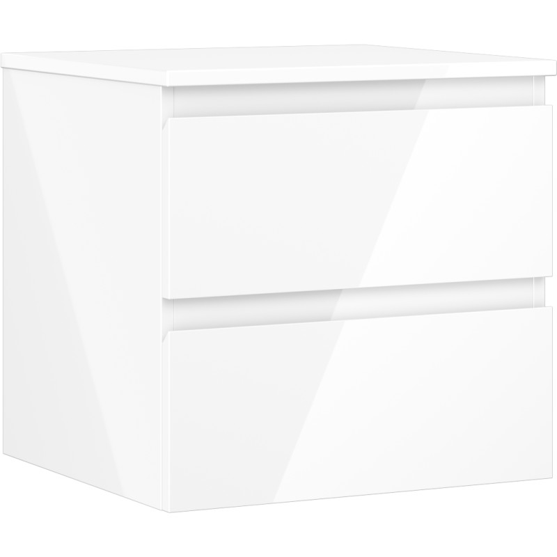 Špecifikácia produktu: Rozmery skrinky: Šírka: 50 cm Výška: 47 cm Hĺbka: 46 cm Farba korpusu: Lesklá biela Materiál korpusu: Lakovaná doska Farba čela: Lesklá biela Materiál čela: Lakovaná MDF doska Štruktúra čela: Hladká Počet zásuviek: 2 výsuv pre ľahký prístup k obsahu zásuvky Povrch odolný voči UV žiareniu Rozmery pracovnej dosky: Šírka: 50,6 cm Hĺbka: 46,5 cm Hrúbka: 1,8 cm Farba pracovnej dosky: Lesklá biela Materiál pracovnej dosky: Lakovaná MDF doska Povrch odolný voči UV žiareniu Ideálny ako podstavec