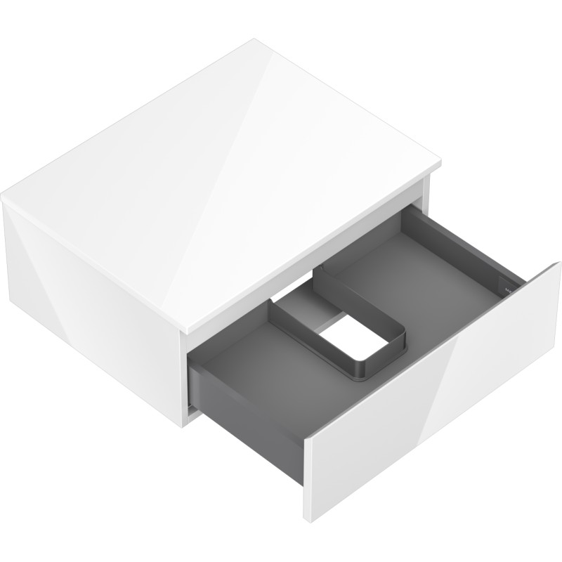 Špecifikácia produktu: Rozmery skrinky: Šírka: 60 cm Výška: 23,5 cm Hĺbka: 46 cm Farba korpusu: Lesklá biela Materiál korpusu: Lakovaná doska Farba čela: Lesklá biela Materiál čela: Lakovaná MDF doska Štruktúra čela: Hladká Počet zásuviek: výsuv pre ľahký prístup k obsahu zásuvky Povrch odolný voči UV žiareniu Rozmery pracovnej dosky: Šírka: 60,6 cm Hĺbka: 46,5 cm Hrúbka: 1,8 cm Farba pracovnej dosky: Lesklá biela Materiál pracovnej dosky: Lakovaná MDF doska Povrch odolný voči UV žiareniu Ideálny ako podstavec