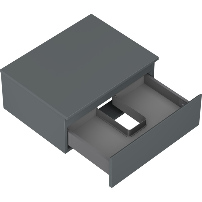 Špecifikácia produktu: Rozmery skrinky: Šírka: 60 cm Výška: 23,5 cm Hĺbka: 46 cm Farba korpusu: Matný grafit Materiál korpusu: Lakovaná doska Farba čela: Matný grafit Materiál čela: Lakovaná MDF doska Štruktúra čela: Hladká Počet zásuviek: výsuv pre ľahký prístup k obsahu zásuvky Povrch odolný voči UV žiareniu Rozmery pracovnej dosky: Šírka: 60,6 cm Hĺbka: 46,5 cm Hrúbka: 1,8 cm Farba pracovnej dosky: Matný grafit Materiál pracovnej dosky: Lakovaná MDF doska Povrch odolný voči UV žiareniu Ideálny ako podstavec
