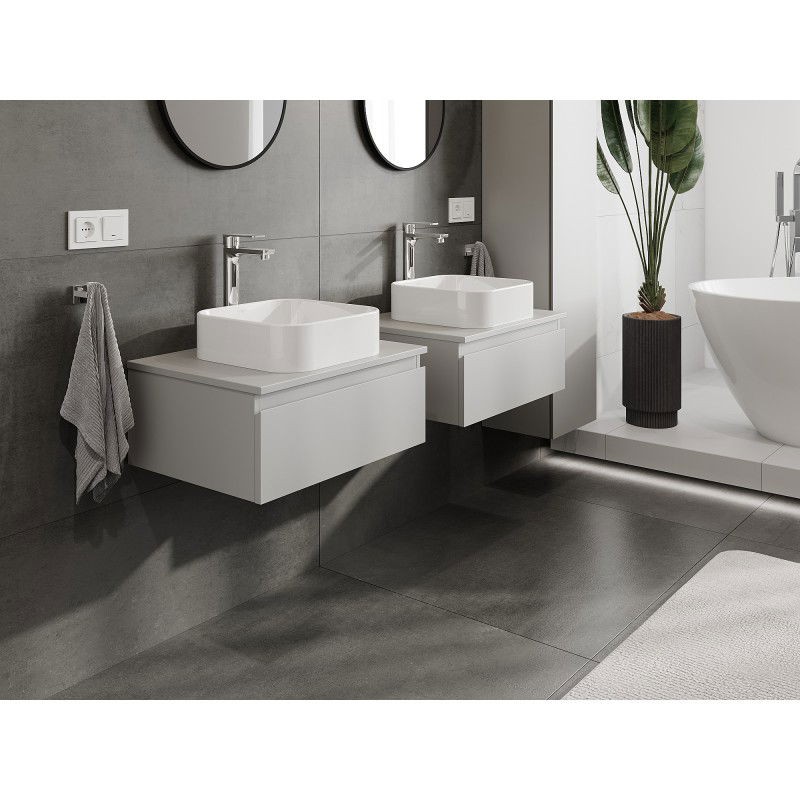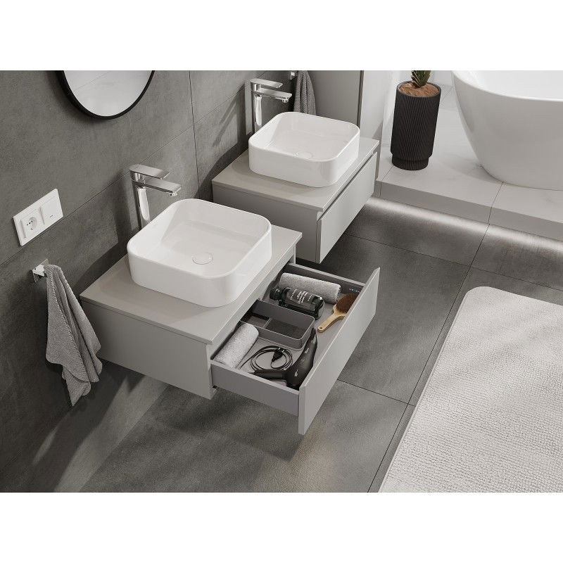 Špecifikácia produktu: Rozmery skrinky: Šírka: 60 cm Výška: 23,5 cm Hĺbka: 46 cm Farba korpusu: Matne šedá Materiál korpusu: Lakovaná doska Farba čela: Matne šedá Materiál čela: Lakovaná MDF doska Štruktúra čela: Hladká Počet zásuviek: 1 výsuv pre ľahký prístup k obsahu zásuvky Povrch odolný voči UV žiareniu Rozmery pracovnej dosky: Šírka: 60,6 cm Hĺbka: 46,5 cm Hrúbka: 1,8 cm Farba pracovnej dosky: Matne šedá Materiál pracovnej dosky: Lakovaná MDF doska Povrch odolný voči UV žiareniu Ideálny ako podstavec