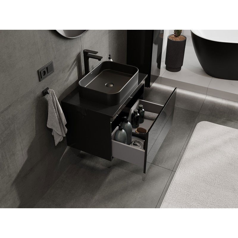 Špecifikácia produktu: Rozmery skrinky: Šírka: 70 cm Výška: 47 cm Hĺbka: 46 cm Farba korpusu: Lesklá čierna Materiál korpusu: Lakovaná doska Farba čela: Lesklá čierna Materiál čela: Lakovaná MDF doska Štruktúra čela: Hladká Počet zásuviek: 1 Priestranný prístup k obsahu zásuvky Povrch odolný voči UV žiareniu Rozmery pracovnej dosky: Šírka: 70,6 cm Hĺbka: 46,5 cm Hrúbka: 1,8 cm Farba pracovnej dosky: Lesklá čierna Materiál pracovnej dosky: Lakovaná MDF doska Povrch odolný voči UV žiareniu Ideálny ako podstavec pre umývadlá na dosku