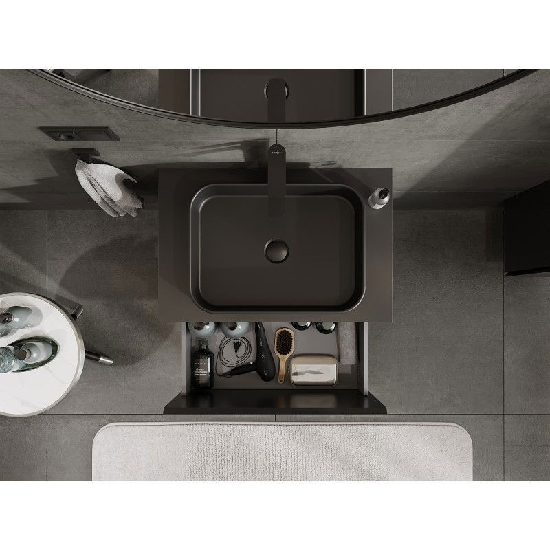 Špecifikácia produktu: Rozmery skrinky: Šírka: 70 cm Výška: 47 cm Hĺbka: 46 cm Farba korpusu: Matná čierna Materiál korpusu: Lakovaná doska Farba čela: Matná čierna Materiál čela: Lakovaná MDF doska Štruktúra čela: Hladká Počet zásuviek: 1 Priestranná ľahký prístup k obsahu zásuvky Povrch odolný voči UV žiareniu Rozmery pracovnej dosky: Šírka: 70,6 cm Hĺbka: 46,5 cm Hrúbka: 1,8 cm Farba pracovnej dosky: Matná čierna Materiál pracovnej dosky: Lakovaná MDF doska Povrch odolný voči UV žiareniu Ideálny ako podstavec pre umývadlá