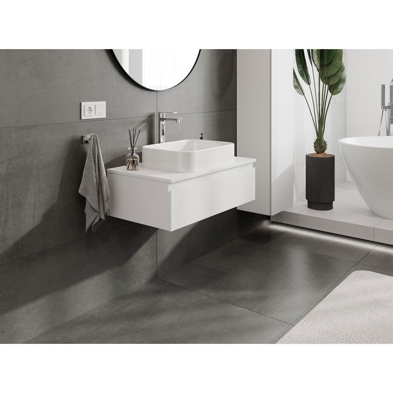 Špecifikácia produktu: Rozmery skrinky: Šírka: 80 cm Výška: 23,5 cm Hĺbka: 46 cm Farba korpusu: Matná biela Materiál korpusu: Lakovaná doska Farba čela: Matná biela Materiál čela: Lakovaná MDF doska Štruktúra čela: Hladká Počet zásuviek: výsuv pre ľahký prístup k obsahu zásuvky Povrch odolný voči UV žiareniu Rozmery pracovnej dosky: Šírka: 80,6 cm Hĺbka: 46,5 cm Hrúbka: 1,8 cm Farba pracovnej dosky: Matná biela Materiál pracovnej dosky: Lakovaná MDF doska Povrch odolný voči UV žiareniu Ideálny ako podstavec