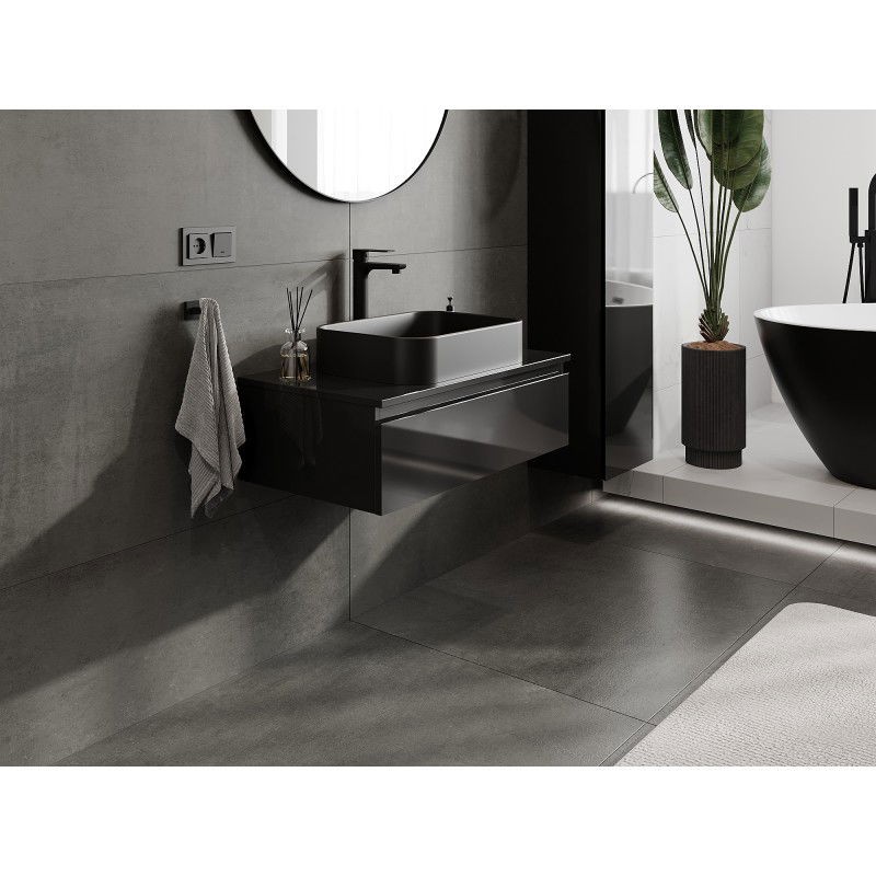Špecifikácia produktu: Rozmery skrinky: Šírka: 80 cm Výška: 23,5 cm Hĺbka: 46 cm Farba korpusu: Lesklá čierna Materiál korpusu: Lakovaná doska Farba čela: Lesklá čierna Materiál čela: Lakovaná MDF doska Štruktúra čela: Hladká Počet zásuviek: 1 Priestor ľahký prístup k obsahu zásuvky Povrch odolný voči UV žiareniu Rozmery pracovnej dosky: Šírka: 80,6 cm Hĺbka: 46,5 cm Hrúbka: 1,8 cm Farba pracovnej dosky: Lesklá čierna Materiál pracovnej dosky: Lakovaná MDF doska Povrch odolný voči UV žiareniu Ideálny ako podstavec pre umývadlá