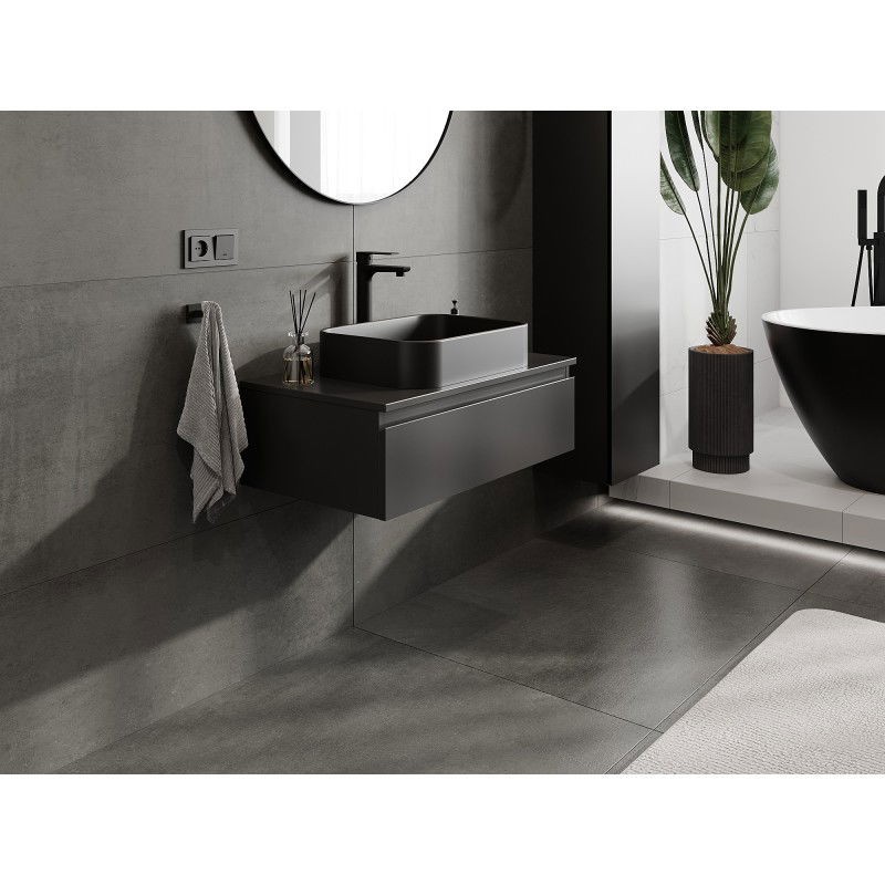 Špecifikácia produktu: Rozmery skrinky: Šírka: 80 cm Výška: 23,5 cm Hĺbka: 46 cm Farba korpusu: Matná čierna Materiál korpusu: Lakovaná doska Farba čela: Matná čierna Materiál čela: Lakovaná MDF doska Štruktúra čela: Hladká Počet zásuviek: 1 Priestor ľahký prístup k obsahu zásuvky Povrch odolný voči UV žiareniu Rozmery pracovnej dosky: Šírka: 80,6 cm Hĺbka: 46,5 cm Hrúbka: 1,8 cm Farba pracovnej dosky: Matná čierna Materiál pracovnej dosky: Lakovaná MDF doska Povrch odolný voči UV žiareniu Ideálny ako podstavec pre umývadlá