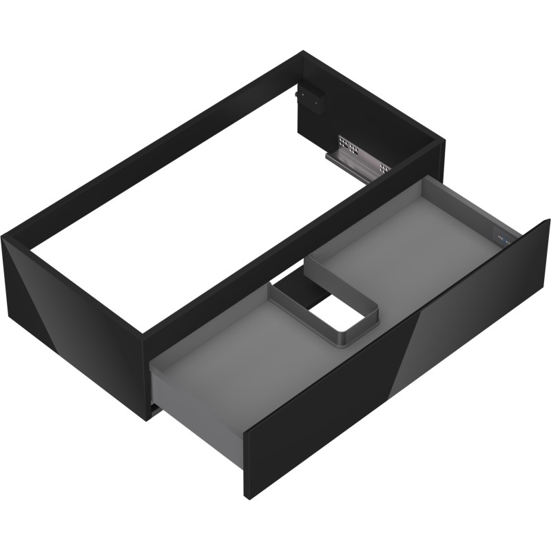 Špecifikácia produktu: Šírka: 90 cm Výška: 23,5 cm Hĺbka: 46 cm Farba korpusu: Lesklá čierna Materiál korpusu: Lakovaná doska Farba čela: Lesklá čierna Materiál čela: Lakovaná MDF doska Štruktúra čela: Hladká Počet zásuviek: 1 Priestranná zásuvka s funkciou tlmný Povrch odolný voči UV žiareniu Kombinovateľný s pracovnou doskou alebo umývadlom Otis, Vela Zostavený produkt