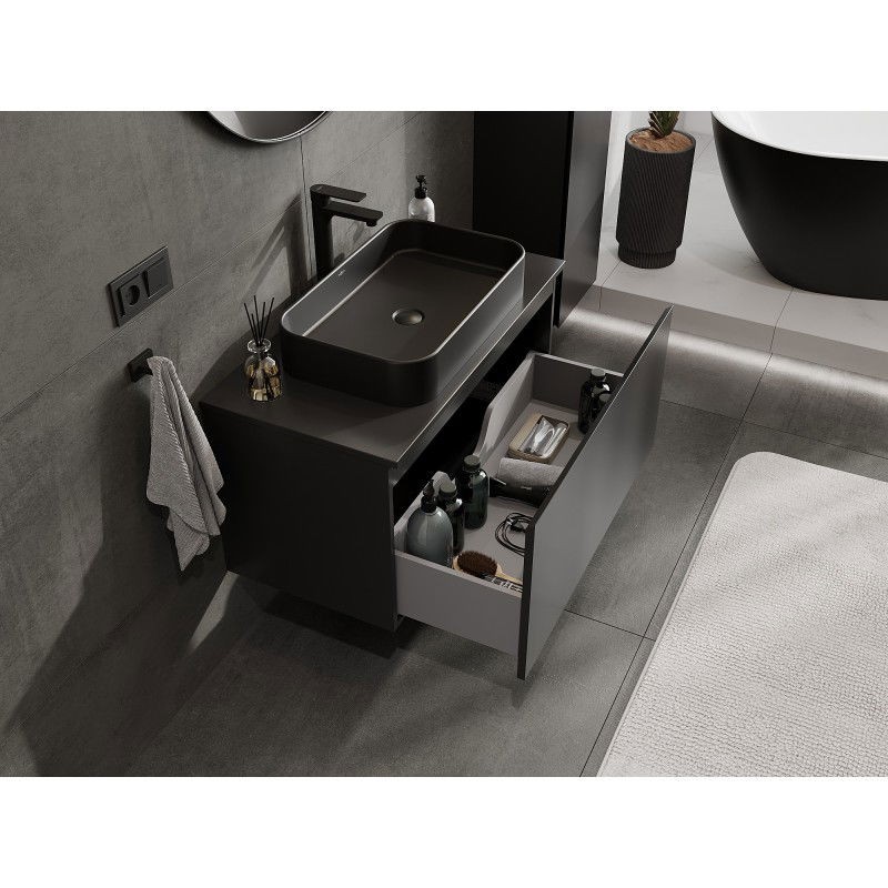 Špecifikácia produktu: Rozmery skrinky: Šírka: 90 cm Výška: 47 cm Hĺbka: 46 cm Farba korpusu: Matná čierna Materiál korpusu: Lakovaná doska Farba čela: Matná čierna Materiál čela: Lakovaná MDF doska Štruktúra čela: Hladká Počet zásuviek: 1 Priestranná ľahký prístup k obsahu zásuvky Povrch odolný voči UV žiareniu Rozmery pracovnej dosky: Šírka: 90,6 cm Hĺbka: 46,5 cm Hrúbka: 1,8 cm Farba pracovnej dosky: Matná čierna Materiál pracovnej dosky: Lakovaná MDF doska Povrch odolný voči UV žiareniu Ideálny ako podstavec pre umývadlá